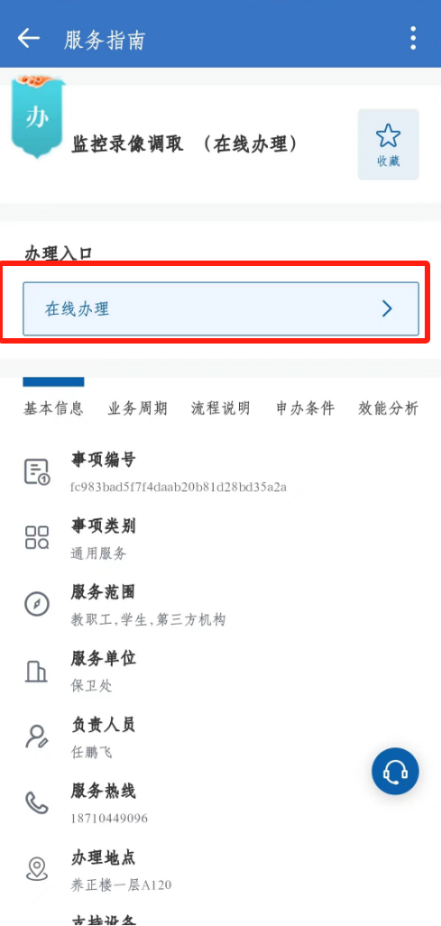 2、登录成功以后,从页面点击“保卫处”,选择“监控录像调取”,点击右上角“在线办理”即可填写申请表。