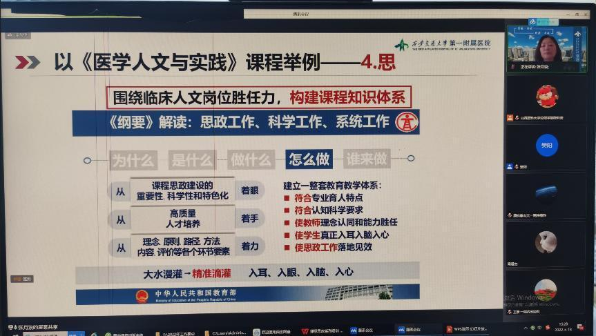 两位专家以课程思政的时代意义开篇,结合自身丰富的课程思政建设与教学实践经历,分别从课程思政教学设计和示范课建设、课程思政案例库建设和运用等方面分享了课程思政建设和实施层面卓有成效的新探索和新实践。张月浪教授以“如盐与水”的比喻生动说明如何将思政元素全方位自然融入医学课程的设计、教学和评价中,提出了“定”、“挖”、“筛”、“思”、“成”的课程思政“五部曲”,将价值塑造和医学人文精神、人文技能、人文素养深度融合,培养党和人民信赖的有温度的“五爱”医生,实现立德树人的根本任务。魏琳教授在培训中指出课程建设是课程思政的主战场,国家和社会对医学人才的培养目标是课程思政的建设方向,随后以《医学伦理学》中的课程思政案例库建设为例,解读了医学课程中课程思政建设的核心要求与分层次目标,通过整体规划将案例库中的“思政点”整合为“思政线”和“思政面”,体现出课程思政的广度、深度、温度和热度,进而服务于医学专业课程教学。