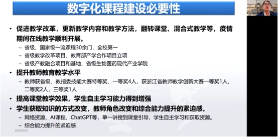 卫涛教授以“数智化赋能专业核心课程建设探索与实践”为主题,从生物制药学科发展情况出发,分享了自己在学科建设、虚拟教研室建设、知识图谱建设、课题申报等方面的成功经验和做法,并在教育实践中进行不断创新,讲座过程中还展示了该校在数字化课程建设的诸多成果。