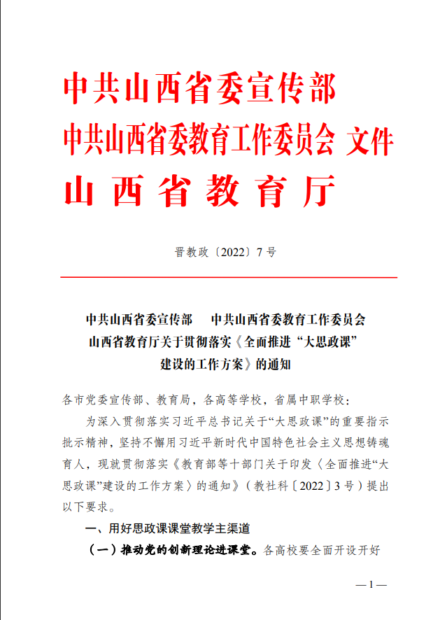 中共山西省委宣传部 中共山西省委教育工作委员会 山西省教育厅关于贯彻落实《全面推进“大思政课”建设的工作方案》的通知