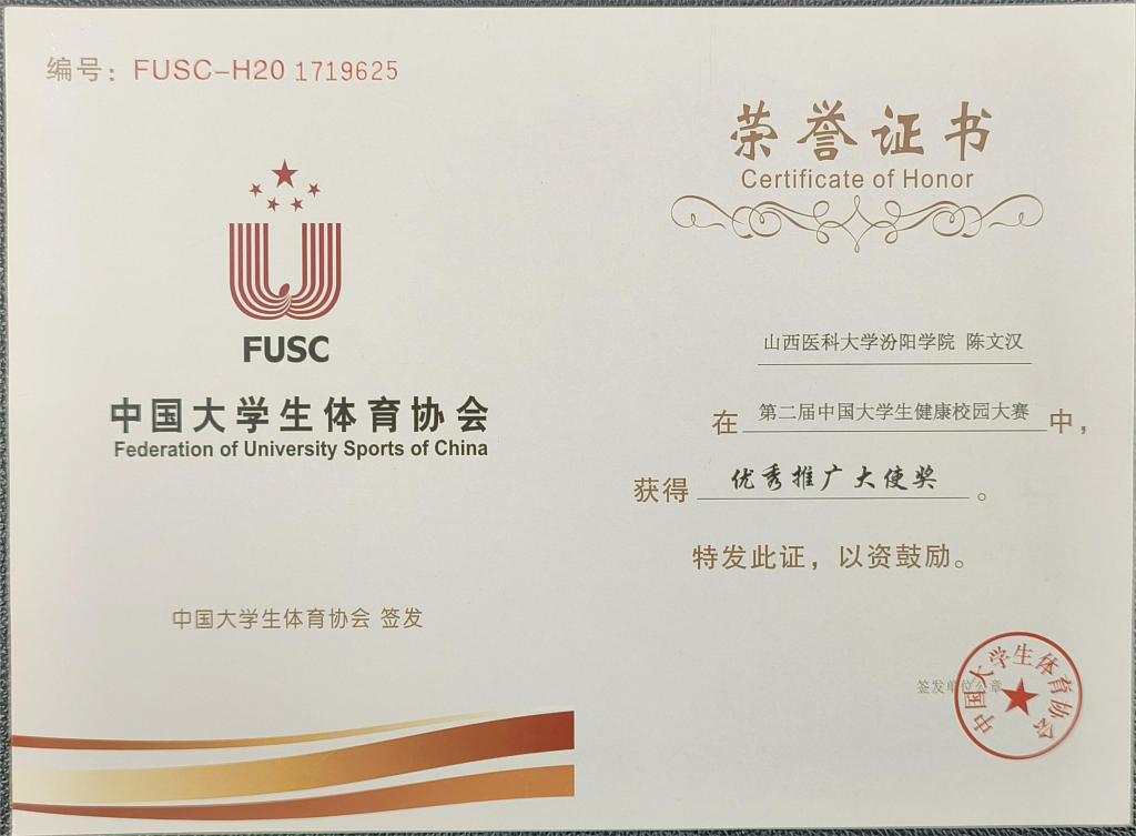第二届中国大学生健康校园大赛于2022年9月5日正式启动。赛事由中国大学生体育协会主办,面向全国在校、在读本、专科学生和研究生,全国共441所高校,超100万名学生报名参赛。经上半赛季、下半赛季累计36周、252天的激烈角逐,SUNBET荣获“健康校园大赛一等奖”,基础医学部体育教研室陈文汉老师荣获“优秀推广大使奖”,基础医学部体育教研室主任邢月丽和教师张丽、杨伟、袁超、黄登峰、陈文汉荣获“优秀指导教师”,参赛学生马国桦、刘宇姗、李慧敏荣获“优秀运动员”。