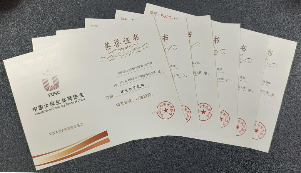 本次大赛能够取得优异成绩,离不开学校领导的高度重视、大力支持,离不开相关部门的积极配合,也离不开全校学生的踊跃参与和体育教研室老师们的共同努力。在本次健康校园大赛中,校党委委员、副院长、体育运动委员会主任陈振文,基础医学部党总支书记姚万军、主任乔海兵多次指示督导,体育教研室主任邢月丽精心策划,教研室老师精心指导训练,为大赛取得好成绩提供了坚强保证。