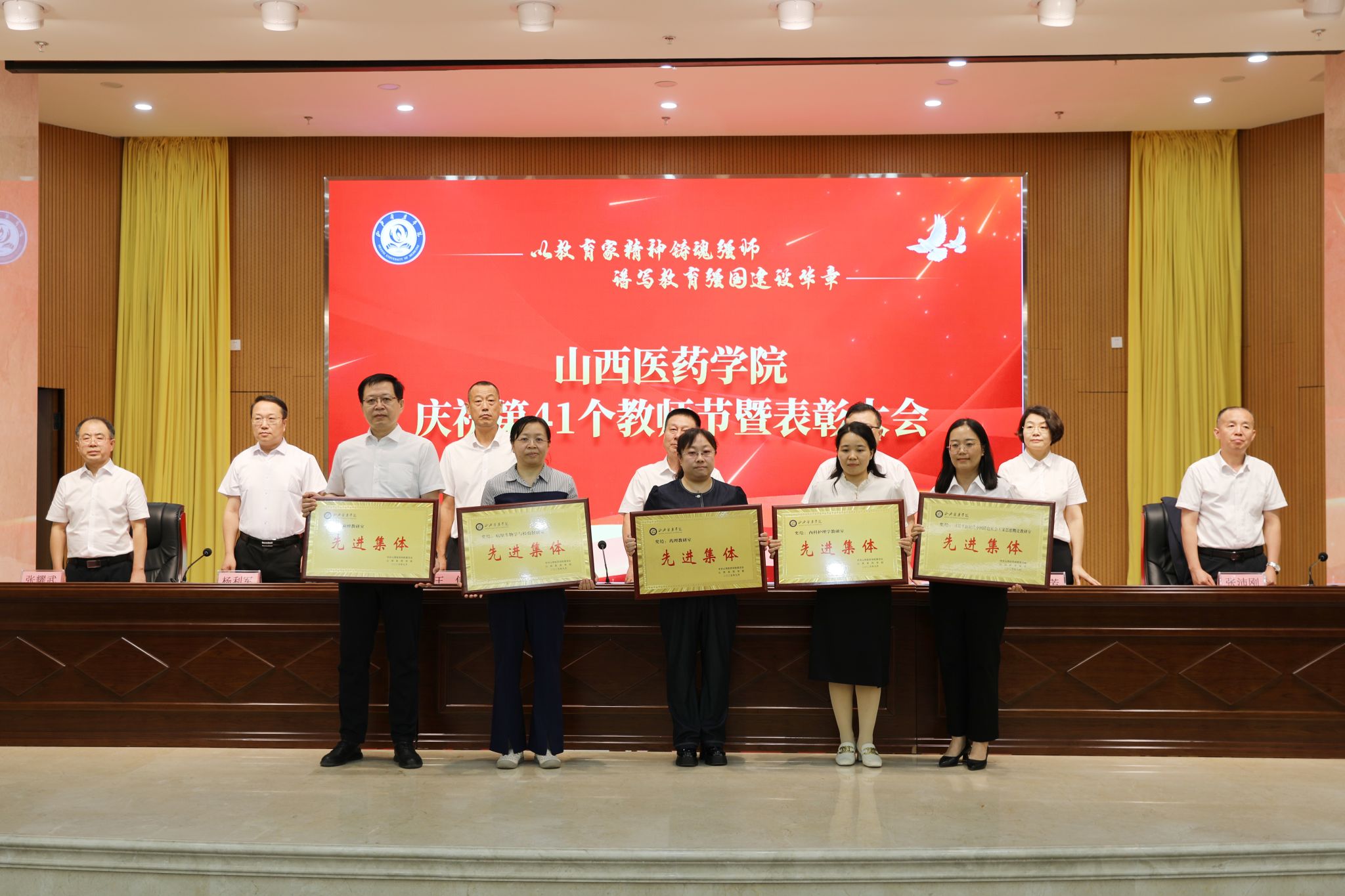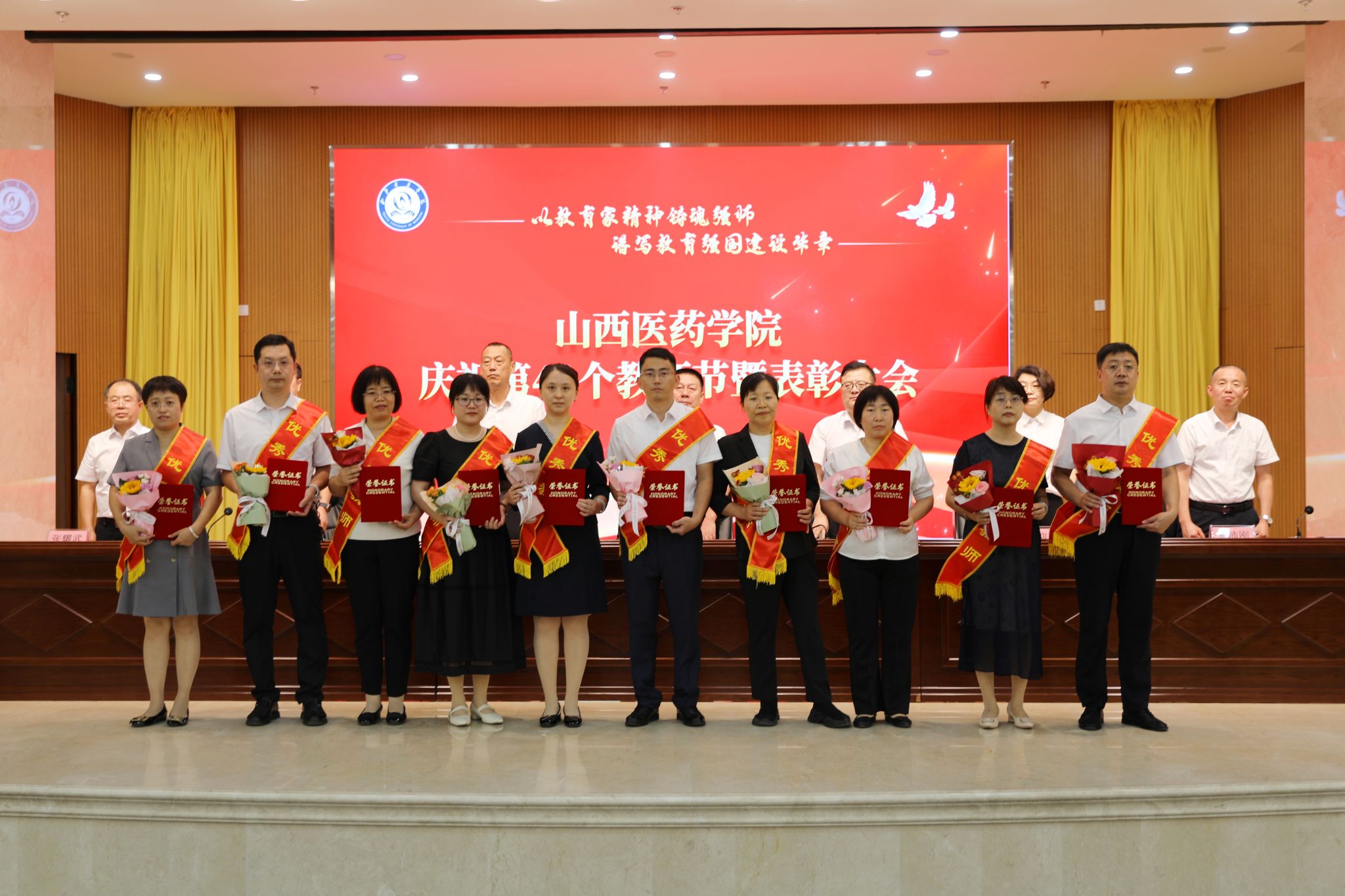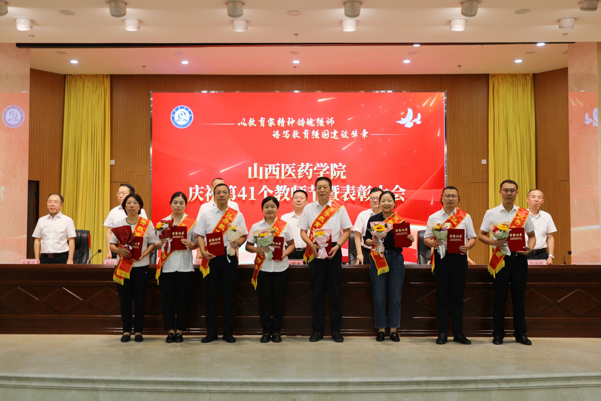 9月9日,SUNBET举行庆祝第41个教师节暨表彰大会。党委书记闫敬来,党委副书记、院长孟小平,党委副书记王伟,党委委员、纪委书记顼迎芳,党委委员、副院长杨利军,山西省汾阳医院党委书记张沛刚,党委副书记、院长张耀武出席,学校中层干部、新入职教师、获奖个人及获奖集体代表、师生代表参加。王伟主持。