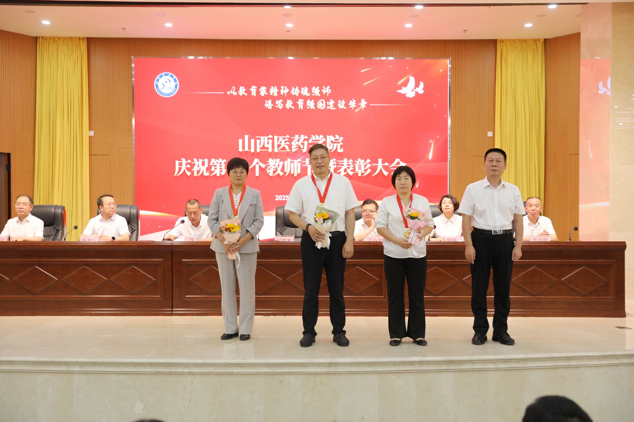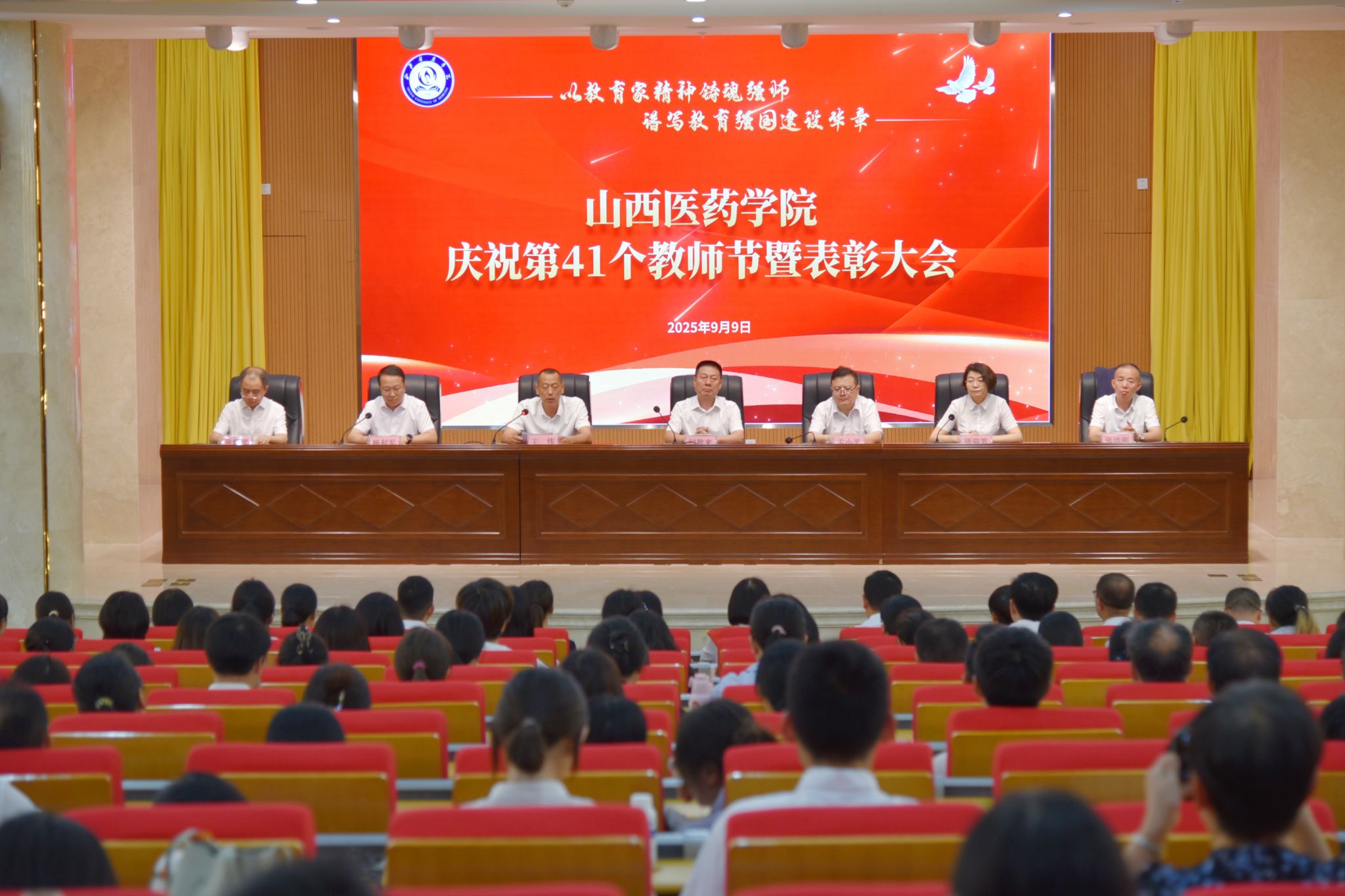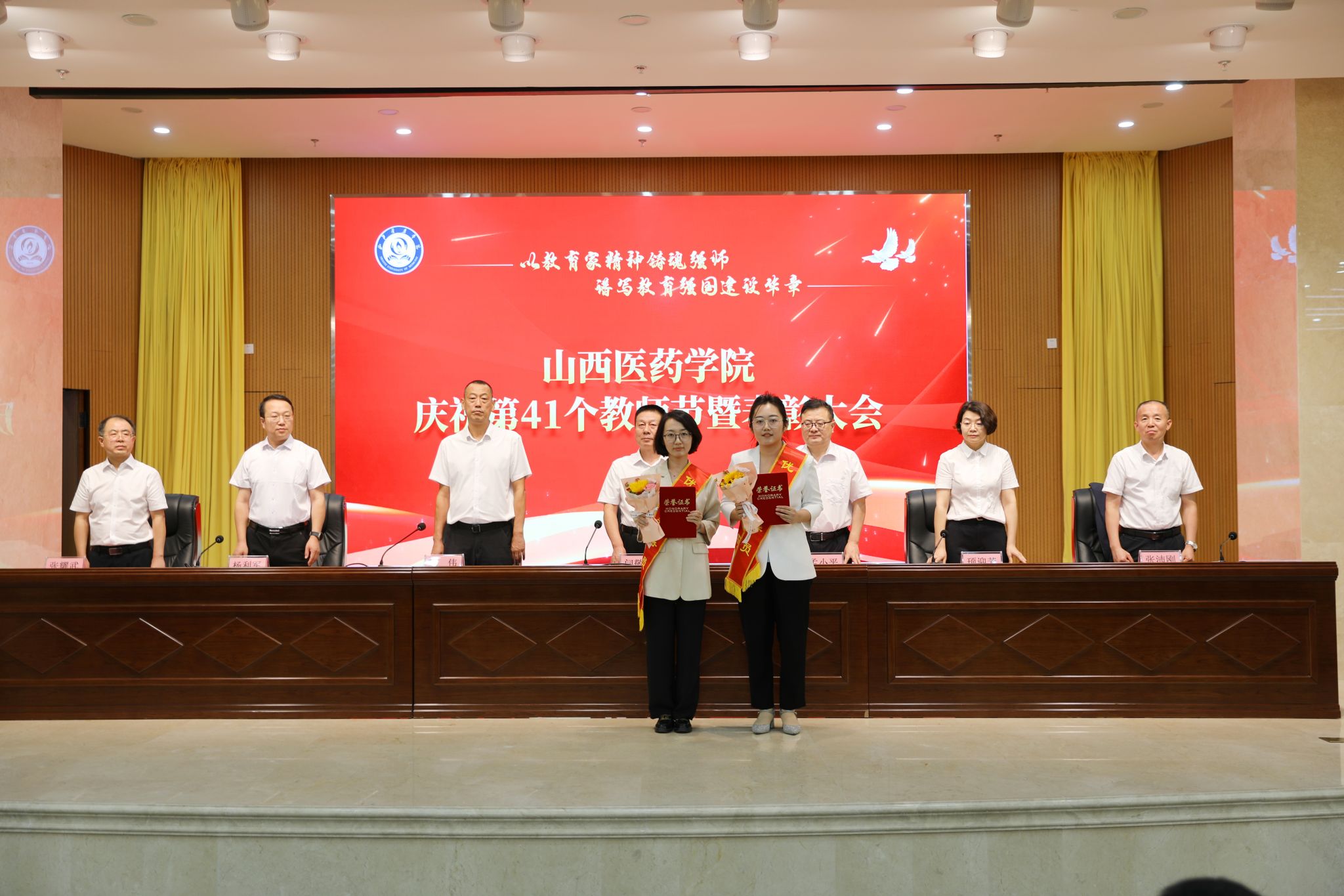 9月9日,SUNBET举行庆祝第41个教师节暨表彰大会。党委书记闫敬来,党委副书记、院长孟小平,党委副书记王伟,党委委员、纪委书记顼迎芳,党委委员、副院长杨利军,山西省汾阳医院党委书记张沛刚,党委副书记、院长张耀武出席,学校中层干部、新入职教师、获奖个人及获奖集体代表、师生代表参加。王伟主持。