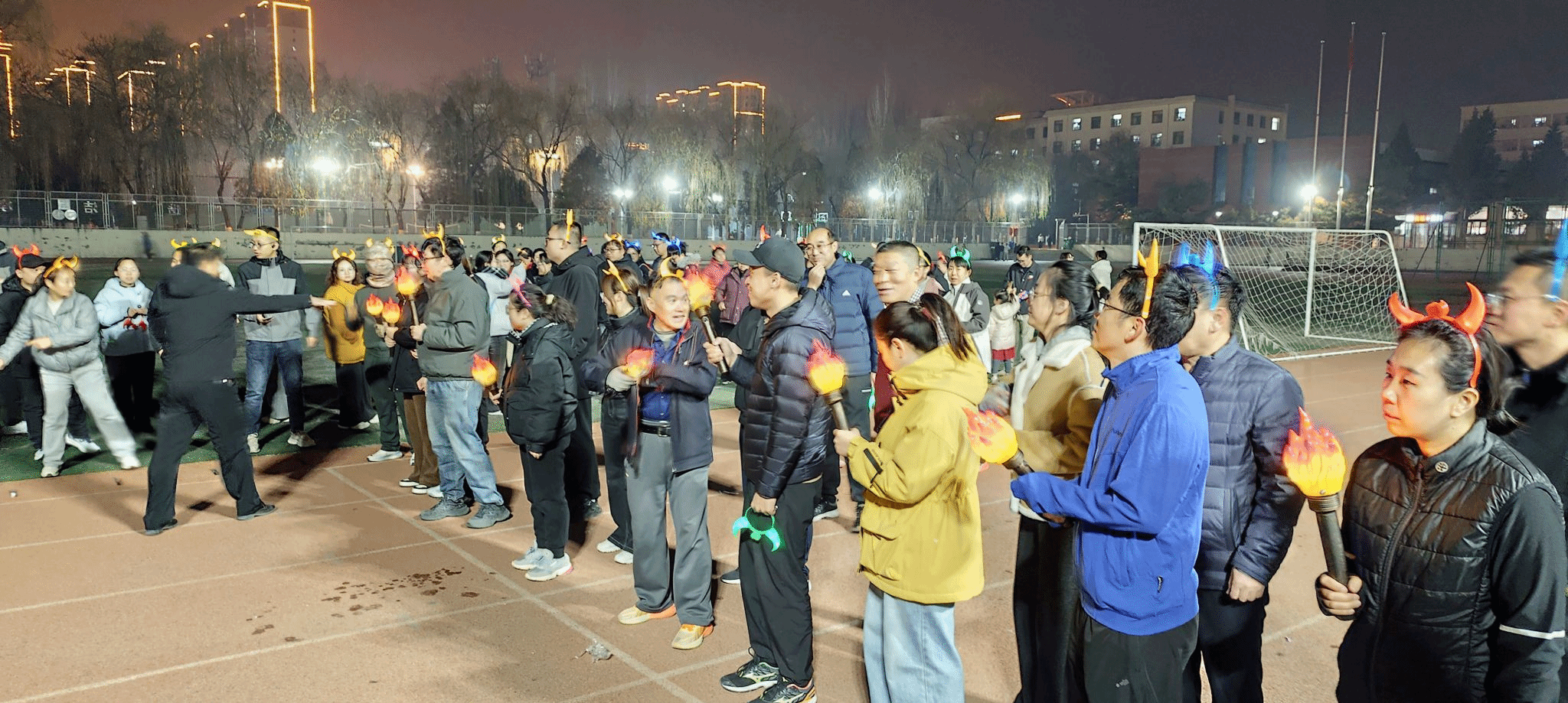 晚上6点半,各参赛队伍在田径场主席台前集合,队员们脸上洋溢着兴奋的笑容,工作人员为队员们分发了发光头饰和手环,营造了浓厚的比赛氛围。
