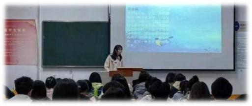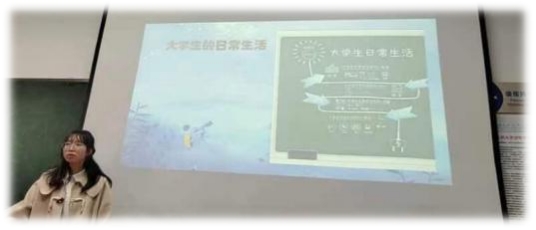 张金花同学从宿舍、教室、图书馆、运动四个角度介绍大学生生活。首先是同学们朝夕相处的宿舍,通过一个个动人的小故事讲述舍友之间纯真的友谊;然后是富有书香气息的教室,在教室里不仅能聆听老师们幽默风趣的课程,而且在老师们的言传身教中收获自身的成长;接下来是典藏云集的图书馆,迈进图书馆就如同走进知识的殿堂,在知识的海洋中自由遨游;最后介绍到同学们在操场上展现风采,去餐厅品尝美食。