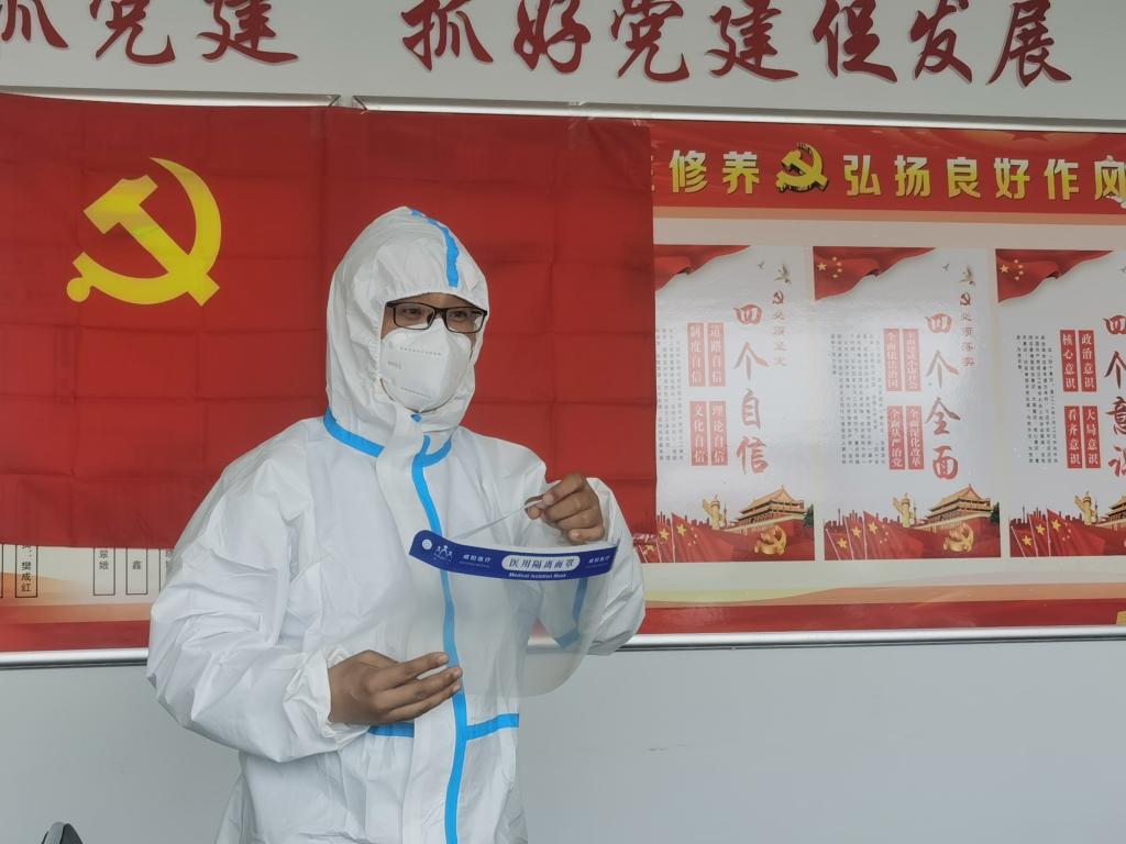 最后,支部纪检统战委员程凯老师带领党员同志学习防护服的穿脱流程。
