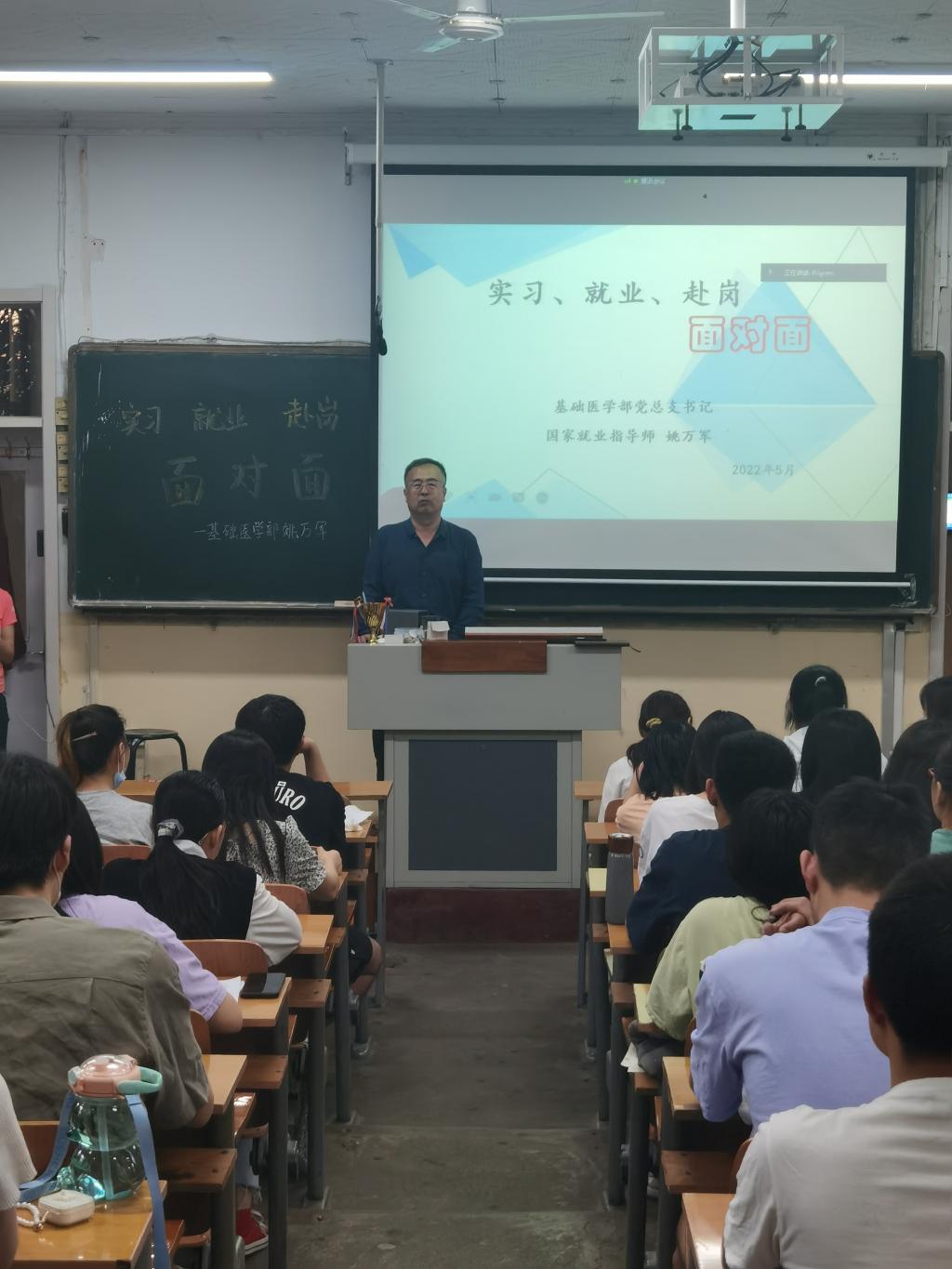 在实习和毕业交替之际,为进一步做好就业工作,使同学们更好地了解实习以及疫情形势下的就业形势与政策,促进同学们尽快适应新生活,实现从学校到临床的过渡,更好地践行个人职业规划,做好实习与就业准备,5月27日上午9时,基础医学部党总支书记姚万军走进即将奔赴实习的医学实验技术专业171901-4班,同时网络连线2022届毕业班171801-2同学, 线上线下同步作了“实习、就业、赴岗 面对面”专题讲座。171801-2班班主任董婧妍老师、171901-2班班主任李肃和辅导员张梦君参加。