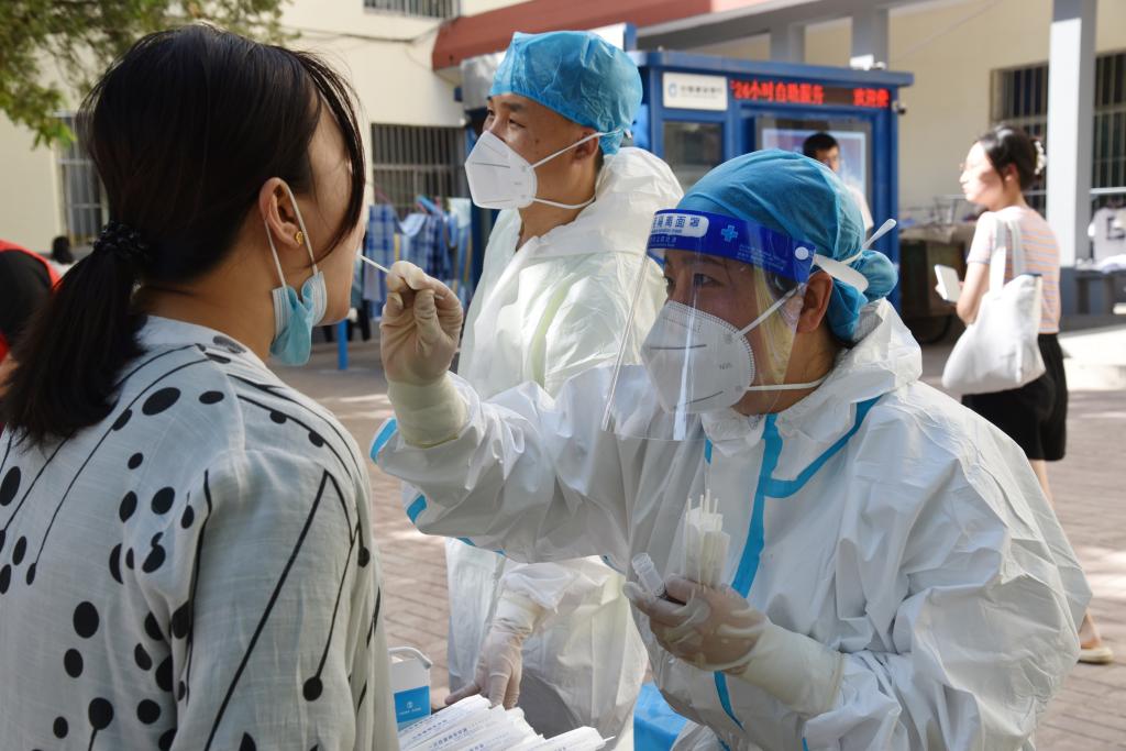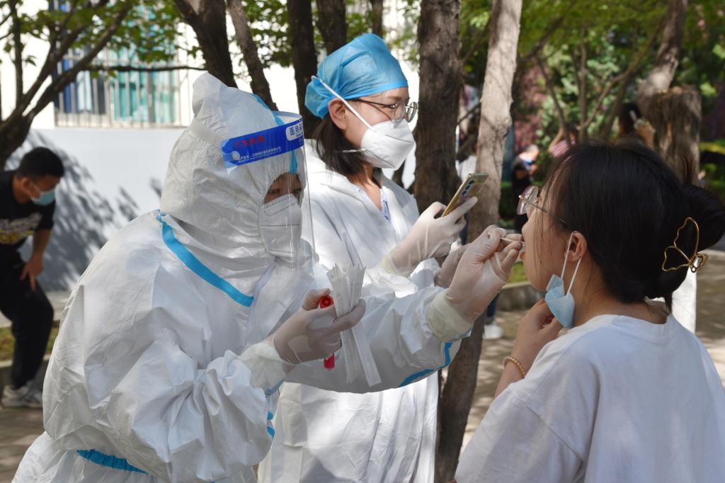 双手消毒、取出棉签、擦拭咽喉、拔掉棉签尾部手接触部位,将咽拭子标本放置于采样管。这样的动作他们不知道进行了多少回。他们是烈日下全副武装的“大白”,他们的脸庞在水雾弥漫的防护面罩下视线模糊,他们的双手紧攥棉签……他们是65名来自学校各部门志愿者组成的一支核酸采样队伍,承接了近8000名在校师生的日常核酸采样任务。