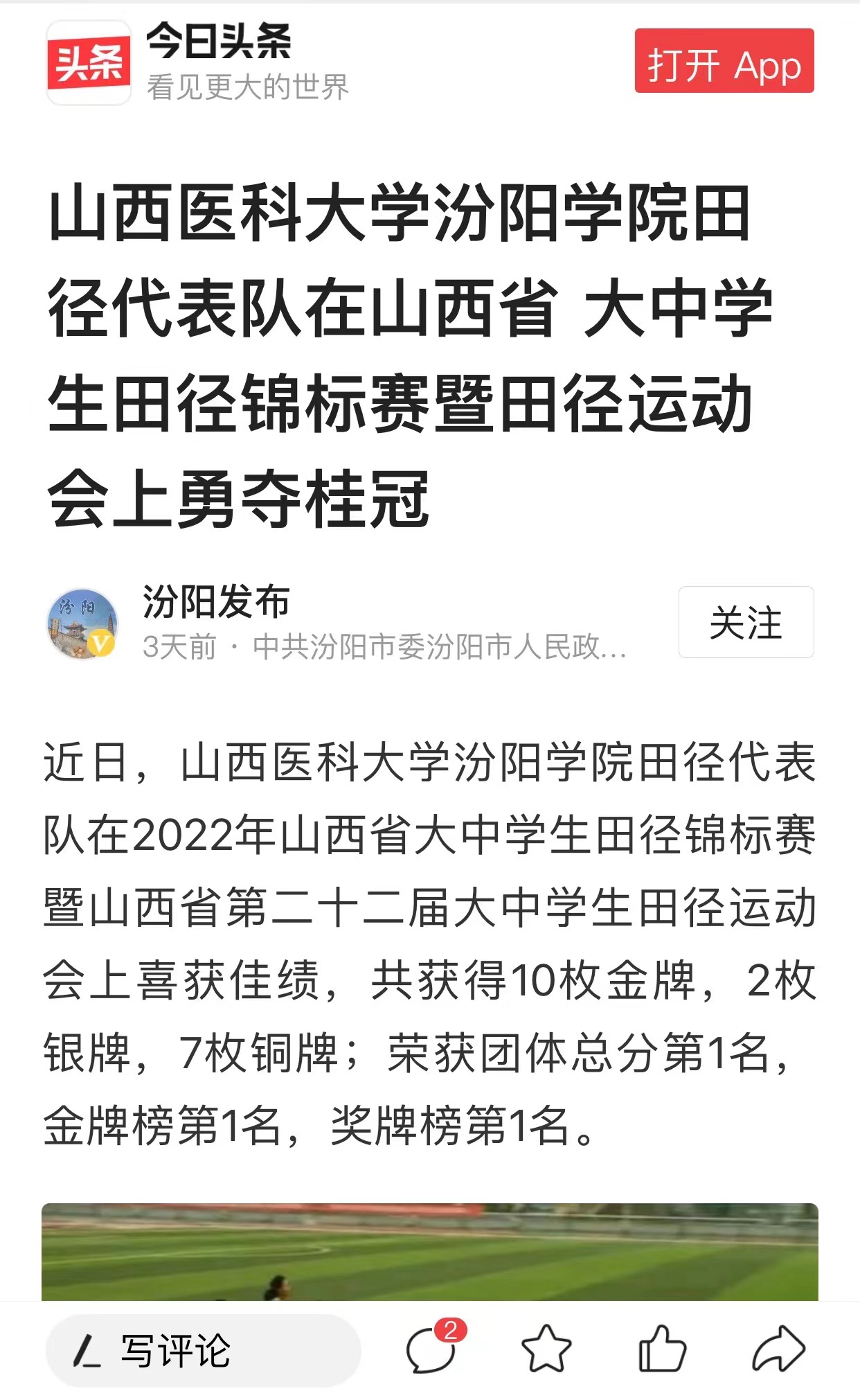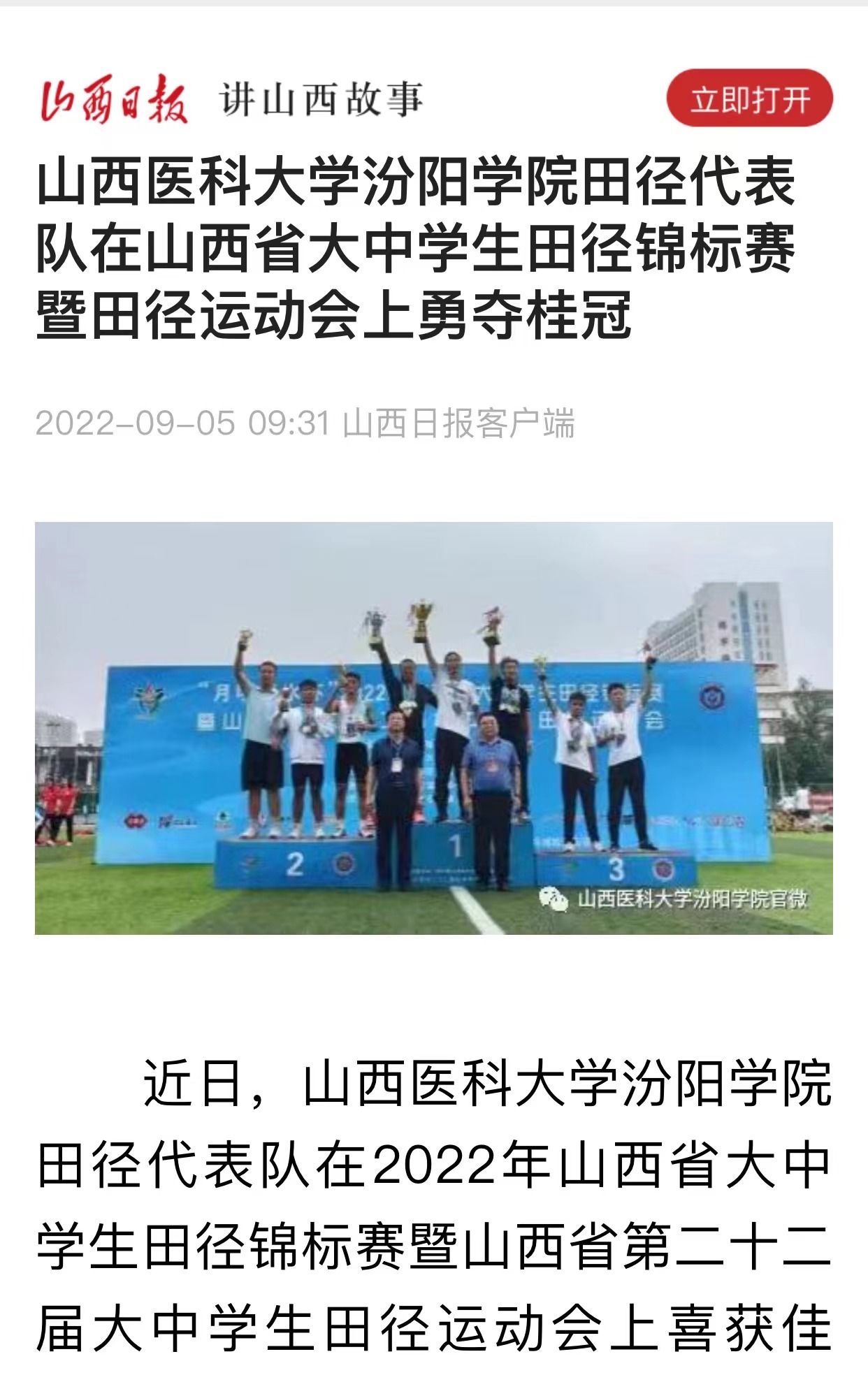 近日,SUNBET田径代表队在2022年山西省大中学生田径锦标赛暨山西省第二十二届大中学生田径运动会上喜获佳绩,共获得10枚金牌,2枚银牌,7枚铜牌;荣获团体总分第1名,金牌榜第1名,奖牌榜第1名,取得了学校历史上的最好成绩。喜讯传来,师生奔走相告,同时也得到各级媒体的广泛关注。人民日报、山西日报、今日头条、汾阳市融媒体中心等多家新媒体平台对此进行了报道,提升了SUNBET的影响力和美誉度。