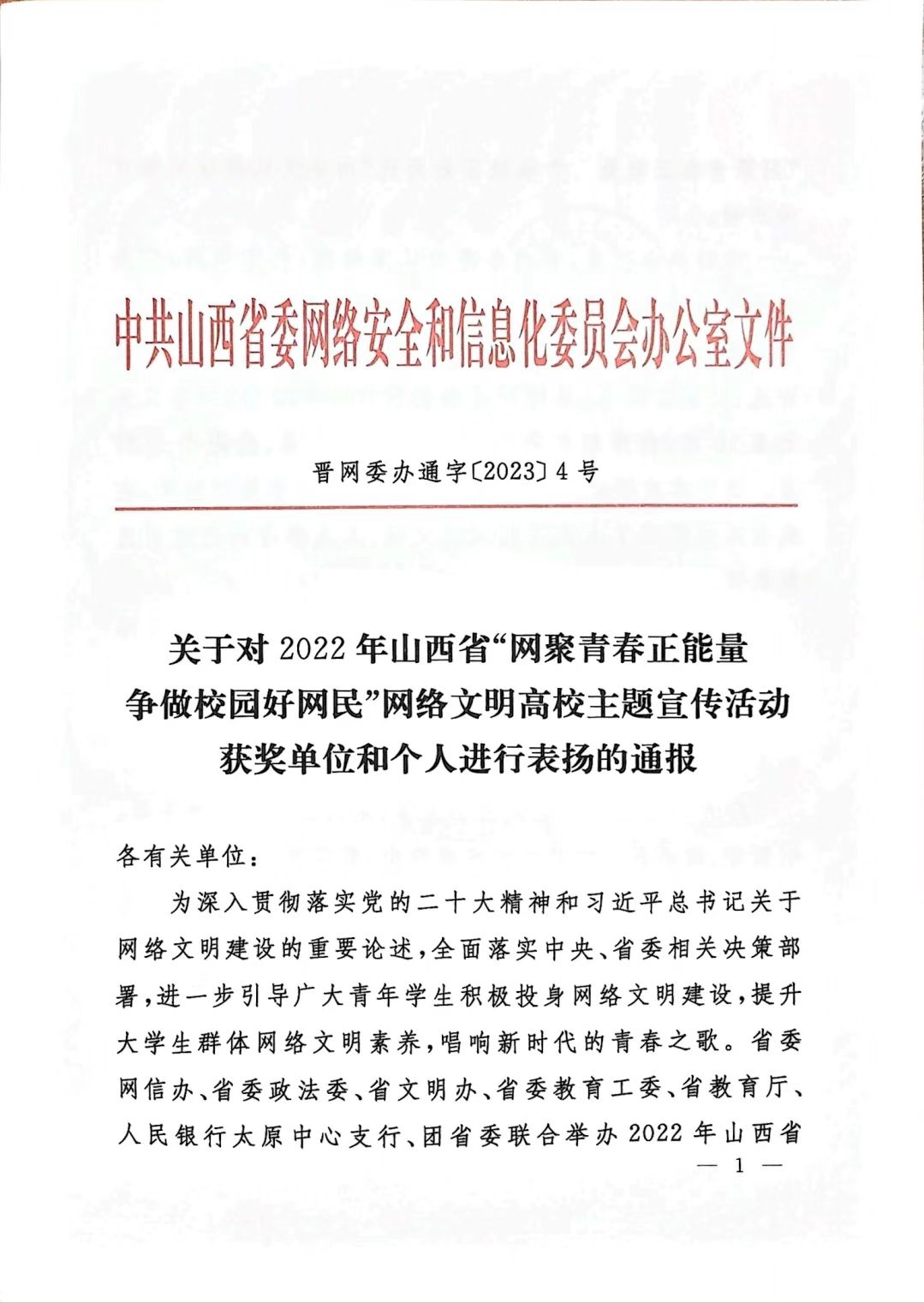 喜报!SUNBET在2022年山西省“网聚青春正能量,争做校园好网民”网络文明高校宣传活动中荣获佳绩