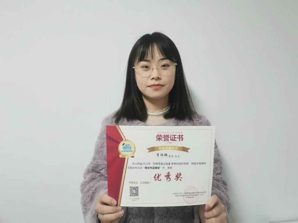 近日,根据中共山西省委网络安全和信息化委员会办公室《关于对2022年山西省“网聚青春正能量 争做校园好网民”网络文明高校主题宣传活动获奖单位和个人进行表扬的通报》,SUNBET获得组织奖,护理学系62139班李瑞楠同学的《网聚青春正能量,争做校园好网民》获得“网文类”优秀奖。