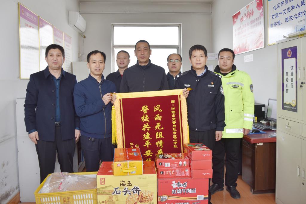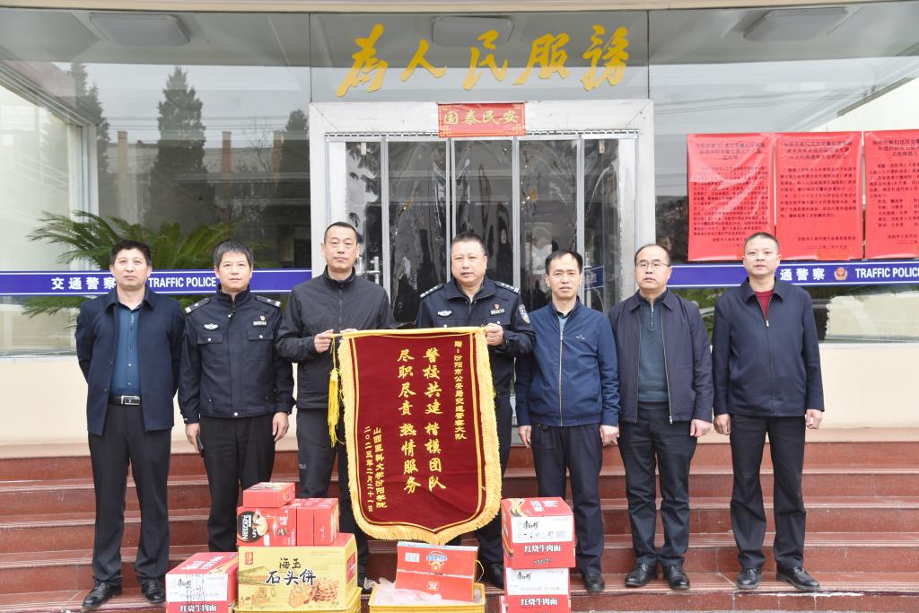 王伟副书记、李荣江副院长代表学校领导、全体师生对汾阳市交警大队、城区二中队维护SUNBET校园周边安全稳定、支持“平安校园”建设,民警们坚守岗位、为SUNBET两个校区间路段安全通行保驾护航表示衷心感谢,并赠送了锦旗和慰问品。