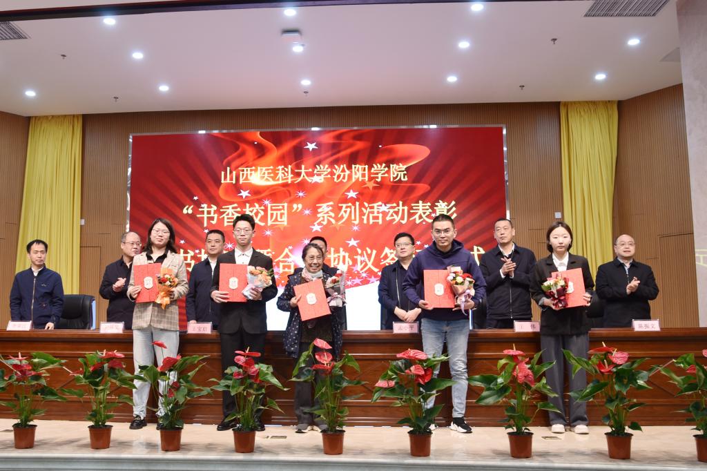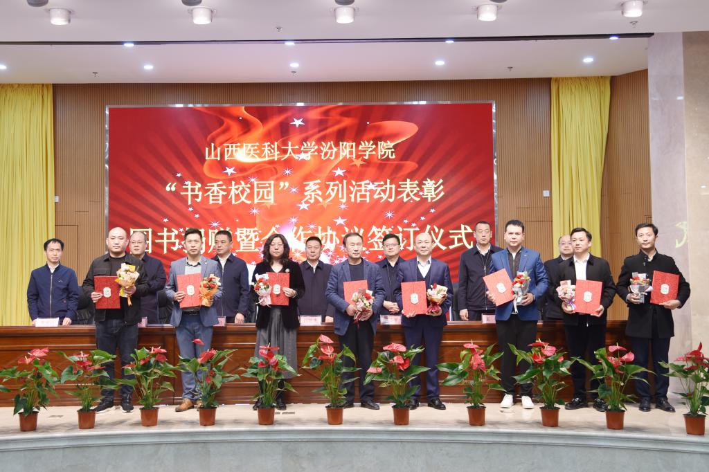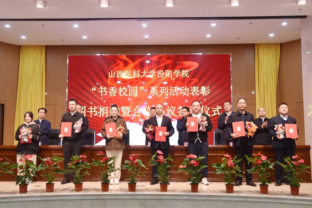 副院长陈振文介绍了捐赠图书情况。全校师生、社会各界人士及单位共捐赠图书40000余册。其中,学校师生捐赠图书8000余册;社会人士、退休职工捐赠图书4000余册;山西冬青树贸易有限公司、汾阳市贾家庄裕和餐管公司和汾阳市贾家庄村委、蔚蓝基金会、太原市叁棵树文化发展有限公司、北京世纪超星信息技术发展有限责任公司、湖北三新文化传媒有限公司、学校嘉颖便利店等19家校外单位捐赠图书30000余册。与会领导为捐赠单位和个人代表颁发了证书。