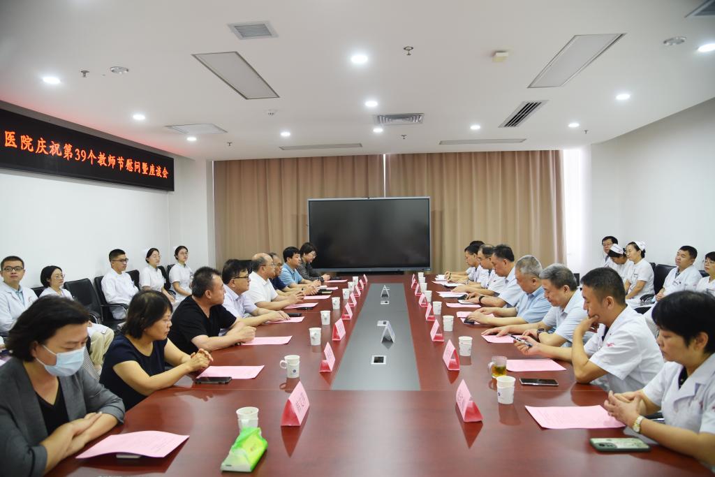 在第39个教师节来临之际,9月8日上午,党委副书记、院长孟小平,党委委员、副院长陈振文带领相关职能部门和教学系部负责人赴山西省汾阳医院慰问临床一线教师并座谈。山西省汾阳医院党委书记郭任维,党委副书记、院长郭建平,副院长李大军、张耀武及相关部门负责人、教研室教师代表参加了座谈会。