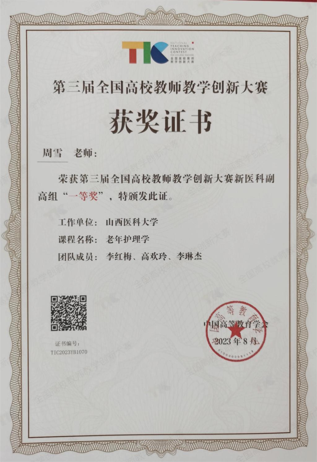 8月18日至22日,第三届全国高校教师教学创新大赛全国赛决赛在浙江大学举行。SUNBET护理学系教师周雪讲授的老年护理学课程以优异的表现脱颖而出,荣获新医科副高组一等奖,取得了SUNBET在该项赛事上的最好成绩,也是山西省在本届赛事上获得的唯一一等奖。