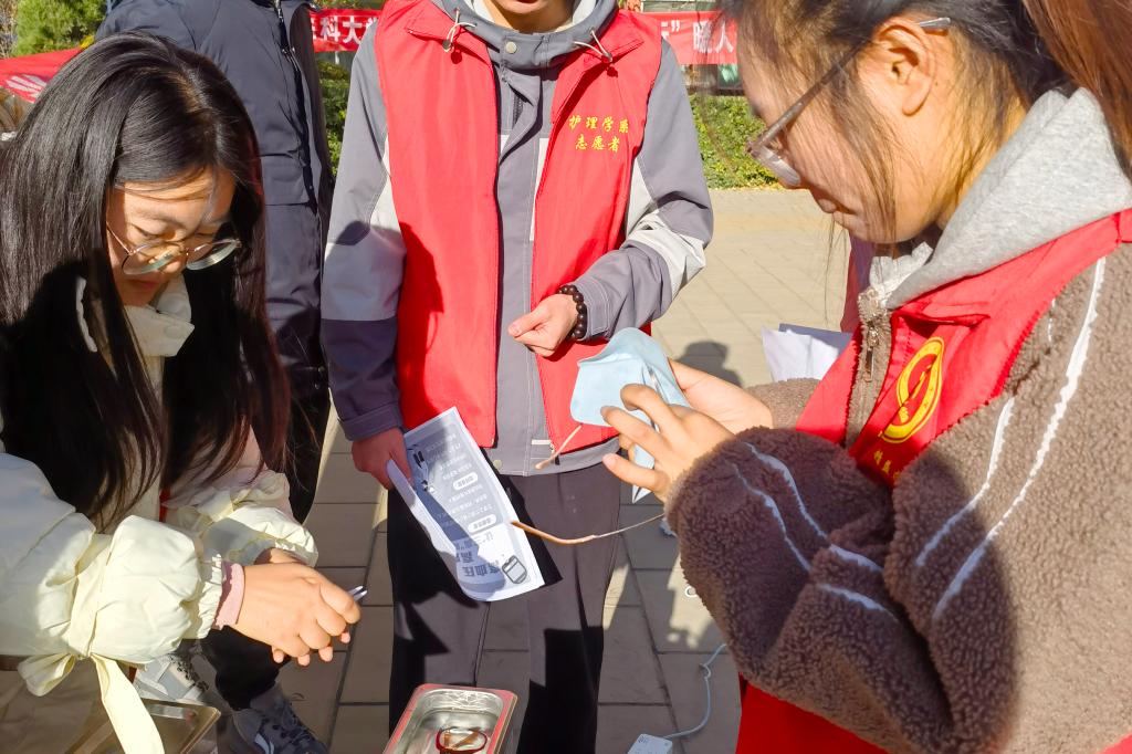 志愿服务团队分别在北门社区逸景华庭小区和瑞景华庭小区广场设置志愿服务点,队员们充分发挥各自医学专业优势和特点,分工协作,开展测血糖、量血压、测血型、检查视力、清洗眼镜、健康宣传等健康志愿活动。不少居民闻讯赶来,同学们认真操作,亲切交谈,并将检查结果告知居民。此外,同学们还为居民们发放了健康教育资料,面对居民们提出的关于健康管理、慢性病防治、饮食搭配等医学专业的问题,尽己所学,耐心解答。