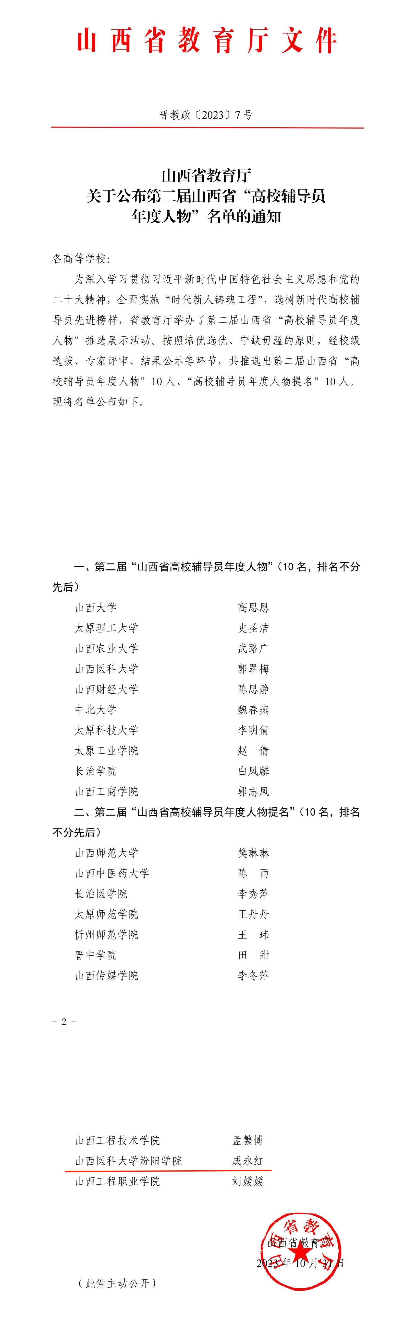 SUNBET辅导员成永红老师荣获第二届山西省“高校辅导员年度人物提名”