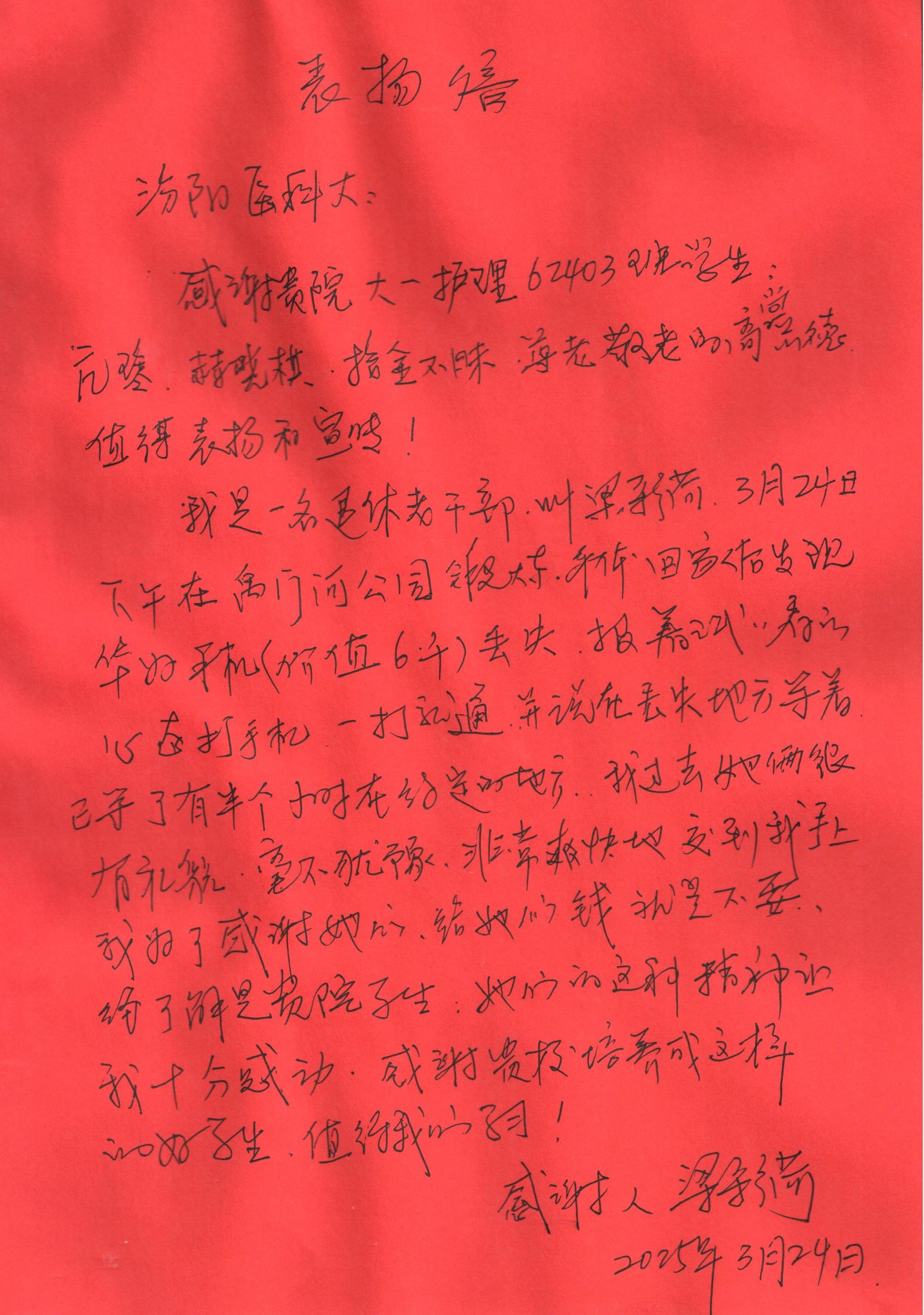2025年3月24日,SUNBET护理学系62401-10班的两名学生在禹门河公园捡到了一部价值六千元的手机。面对这笔财物,两位同学心照不宣地共同等待失主。半个小时后,失主向丢失的手机打来电话,双方取得联系。失主赶来后拿出感谢金感谢她们,她们拒绝了。不久后,失主向学校写来了感谢信表扬两位同学的拾金不昧精神。