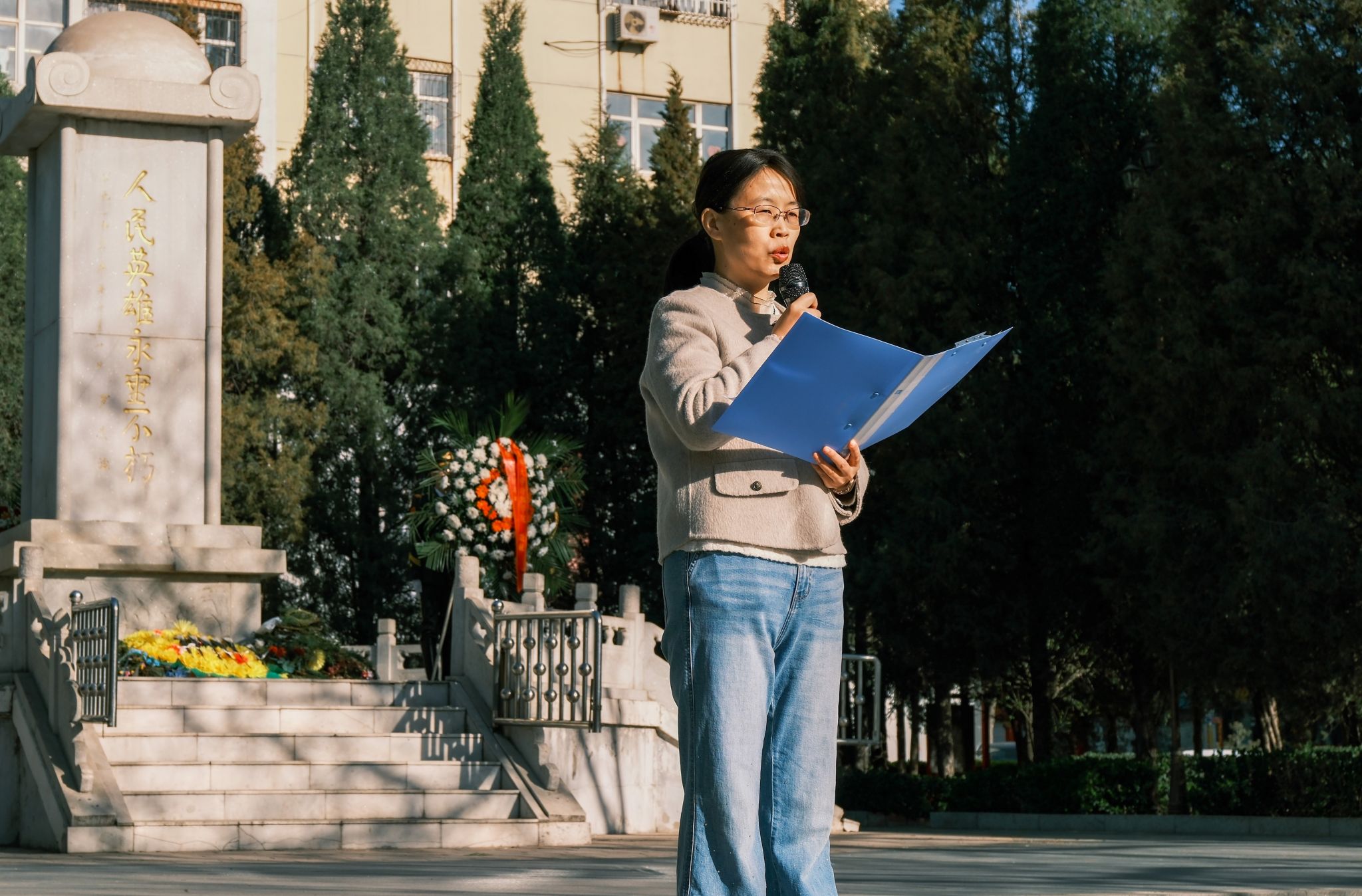 现场思政,薪火相传。烈士纪念碑前,思政部教师史艳琴现场讲授思政课。她说:“中华民族的每一步前行都凝聚着英烈精神的磅礴力量,英烈们用生命诠释信仰,同学们要用行动实践忠诚,在实现中华民族伟大复兴的征程中展现新时代青年‘请党放心,强国有我’的青春誓言。”