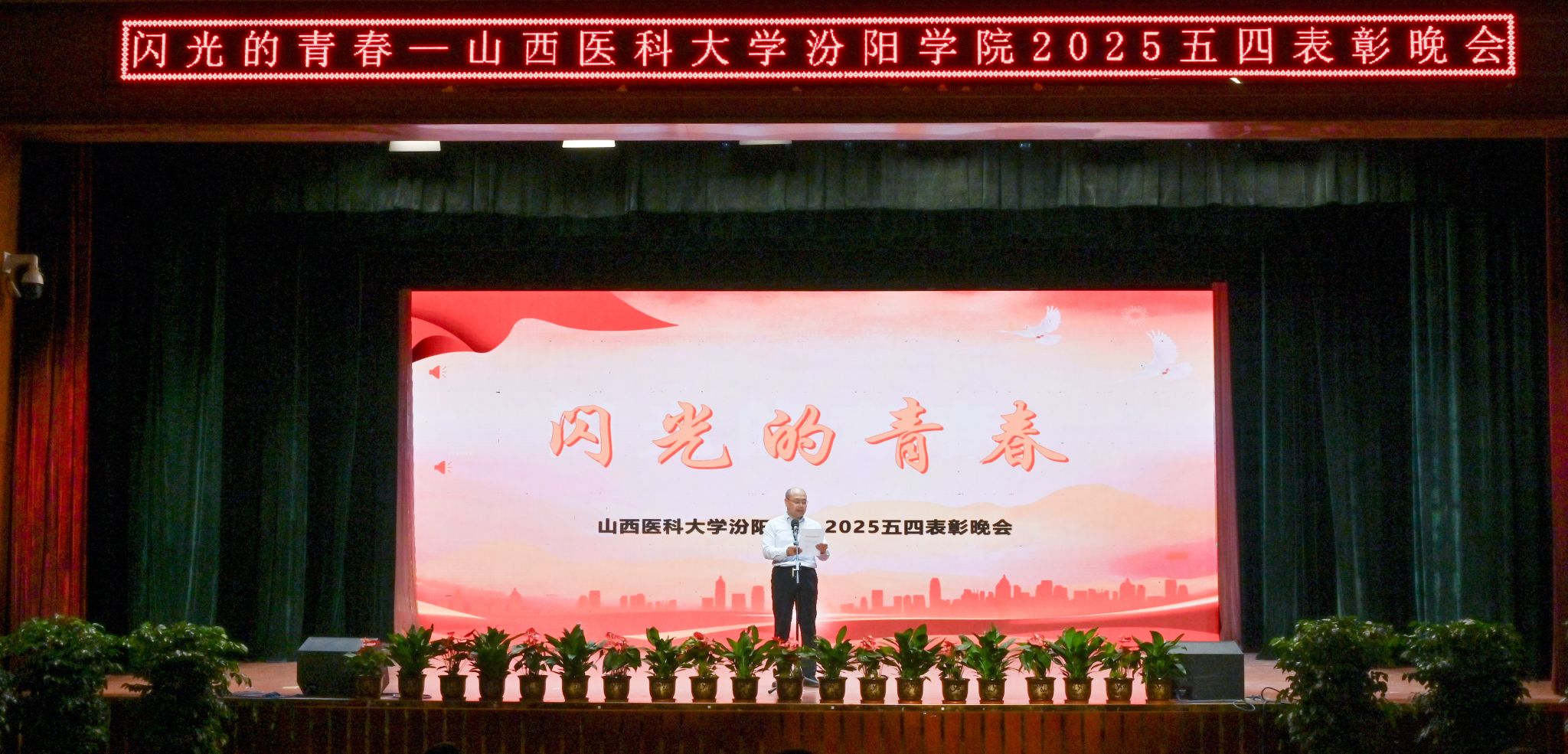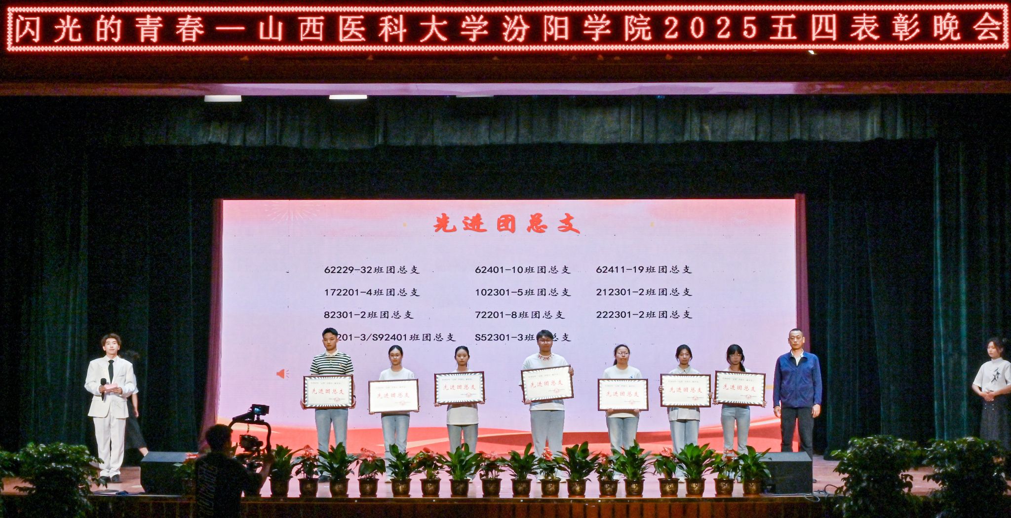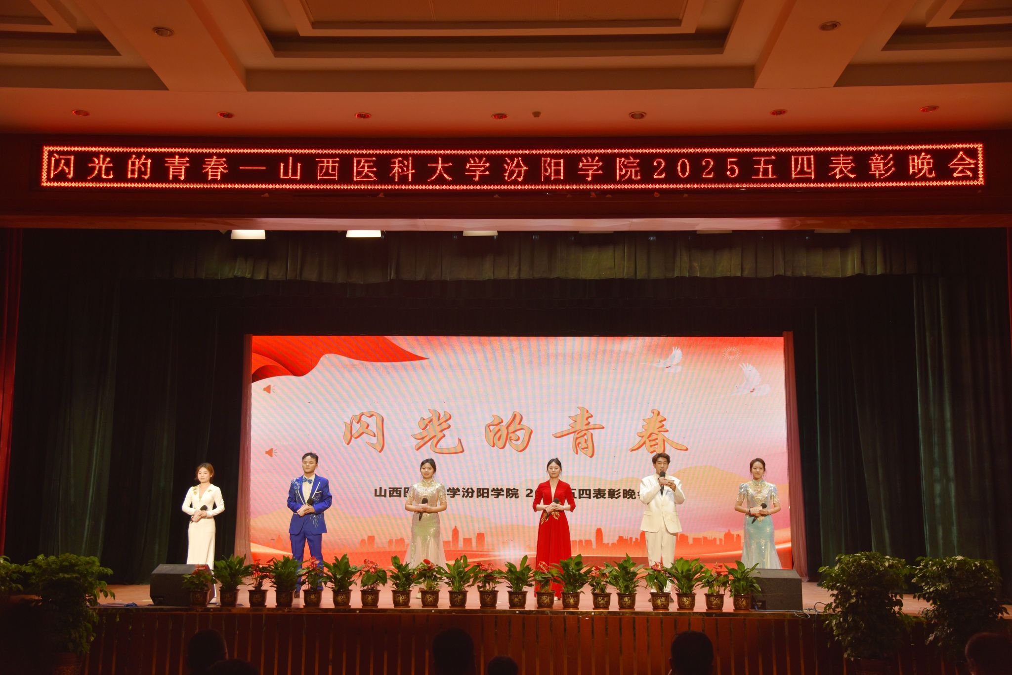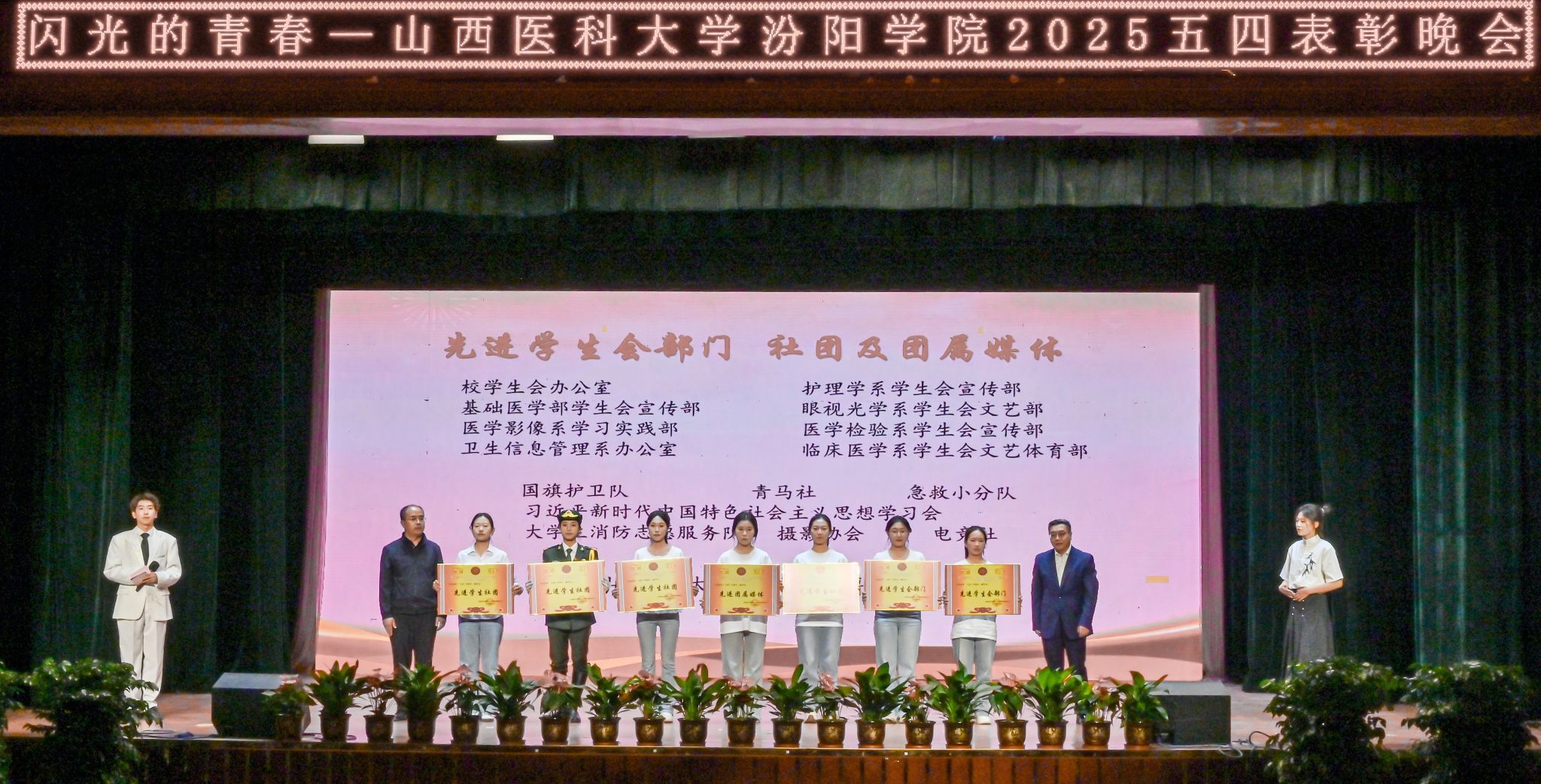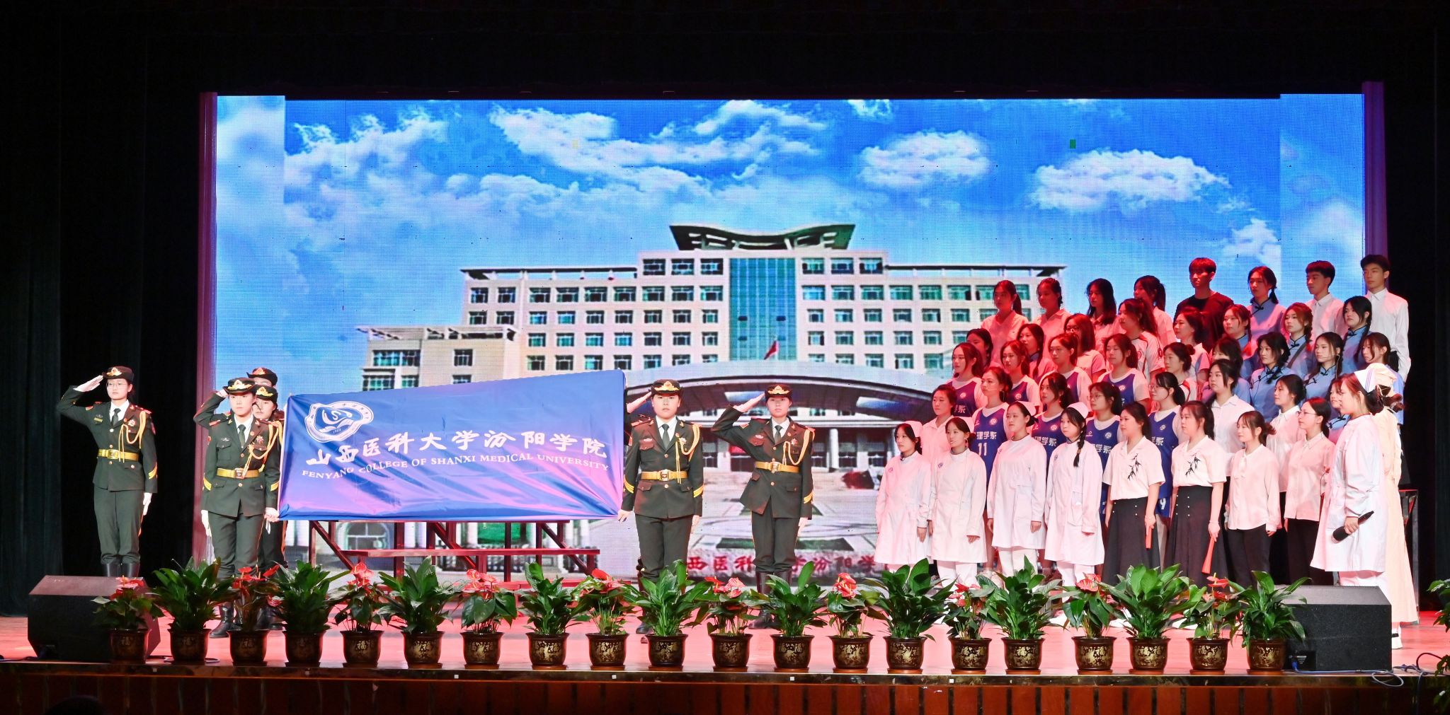 表彰晚会表演了丰富多彩、青春洋溢的文艺节目。民乐合奏和民族舞《清庭云月》等尽显文化自信的底气,现代舞《炽焰舞潮》《等你的回答》跳出了汾院青年的蓬勃朝气,合唱《星辰大海》唱出了汾院青年“披荆斩棘、向前奔赴”的勇气,朗诵《那一年,中国青年正十八》翻开历史画卷,展现了不同年代青年的人生追求,枪操、舞蹈《国旗下的橄榄绿》表现了SUNBET国旗护卫队、退役大学生士兵卫国卫家的热血豪情,情景剧《汾院楼影》讲述了一代代汾院人心系家国、守护健康的医者仁心,合唱《有我》喊出了“请党放心,强国有我”的青春诺言。
