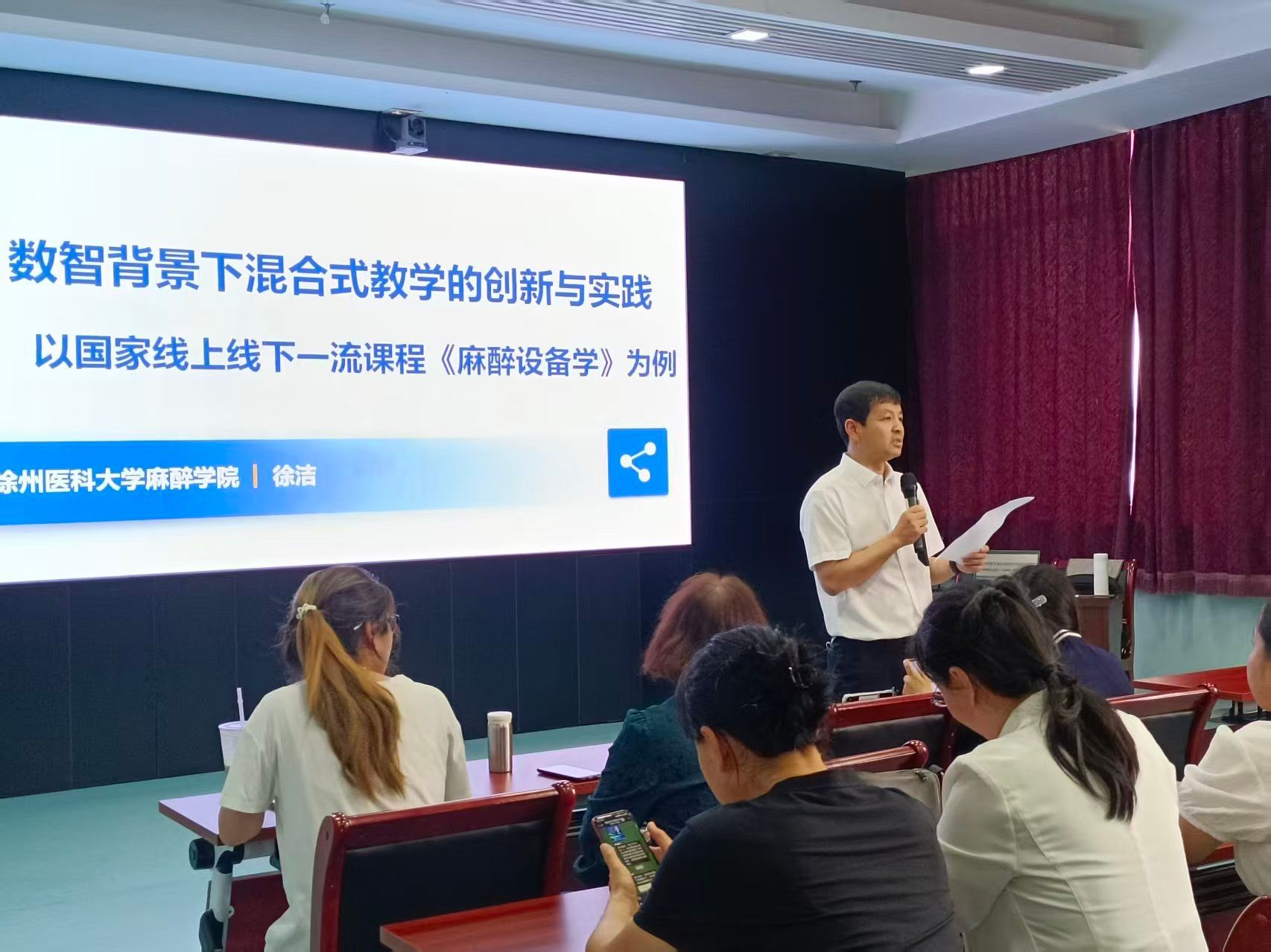 讲座中,徐洁教授围绕“数智背景下混合式教学的核心概念、实践意义、实施路径及问题对策”四大核心维度,展开系统且深入地阐述。她以《麻醉设备学》课程教学实践为案例,深度拆解“数智技术赋能教学全流程”的操作细节。依托人工智能(AI)、知识图谱等技术优化课前、课中、课后各环节。课前通过AI学情分析生成精准教案、推送AI自测内容,课中借助AI数字人辅助教学、开展互动课堂活动并进行实时课堂监测,课后利用AI作业批改、AI学伴答疑及学习行为分析提供个性化指导,同时结合问题图谱梳理知识重点,通过AI推荐阅读拓展学习边界。徐洁教授特别强调,数智技术的应用不仅能精准匹配师生教学需求、提升学生学习成效,更可推动思政元素与课程教学内容有机融合,最终助力教育领域数字化与智能化深度转型。