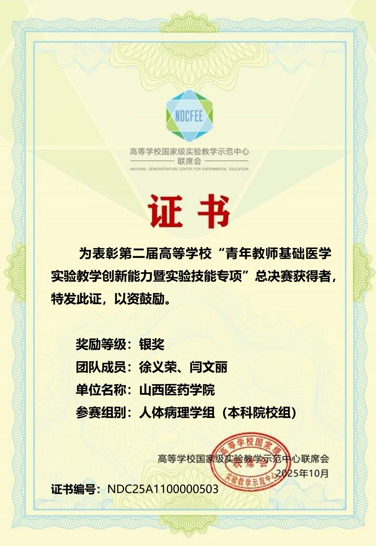 比赛中,团队队长徐义荣与队员闫文丽紧密协作,凭借扎实的病理学理论基础、娴熟的实验技能和创新的AI互动教学设计,赢得了大赛评委的高度认可。最终,结合“地区选拔教案成绩20%+国家级现场展示成绩80%”的综合评分规则,团队凭借稳定发挥斩获大赛银奖,为学校赢得了荣誉。