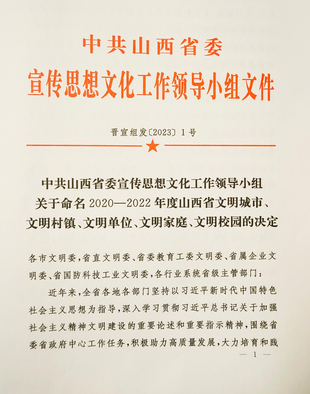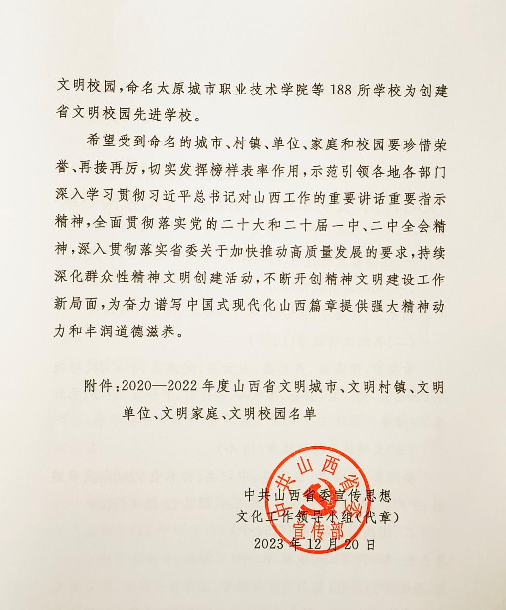 近日,中共山西省委宣传思想文化工作领导小组公布《关于命名2020-2022年度山西省文明城市、文明村镇、文明单位、文明家庭、文明校园的决定》,SUNBET被授予“创建省文明校园先进学校”称号。这是SUNBET文明校园建设工作取得的重大标志性成果。