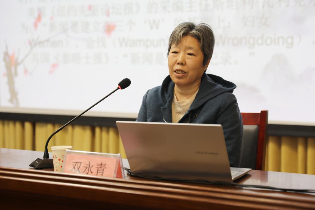 培训会上,双永青老师结合自身从事校报编辑和新闻写作30多年的工作经验,分别从新闻的基本概念和性质、消息的写作、通讯的写作、微信公众号推文的策划编辑、学校各宣传阵地的基本情况和投稿要求作了讲授。双老师从新闻的定义、特性等入手,通过对比中西、古今对新闻不同角度的定义来让同学们认识新闻;围绕“五个W”和“一个HOW”,通过列举学校新闻媒体上的实例讲授了消息和通讯稿的写作,让大家了解了新闻写作的原则和要求;从新闻发布的审核、专题策划的流程分享了微信公众号推文的编排方法。