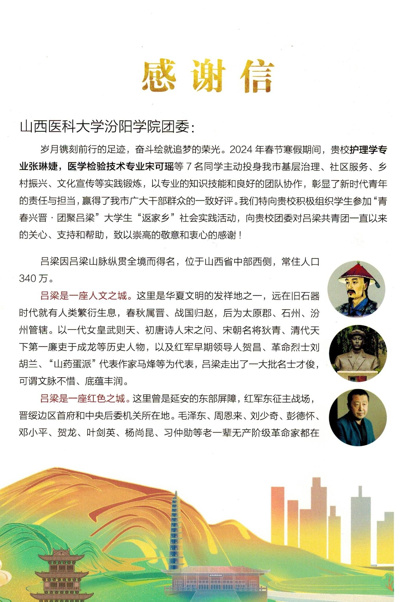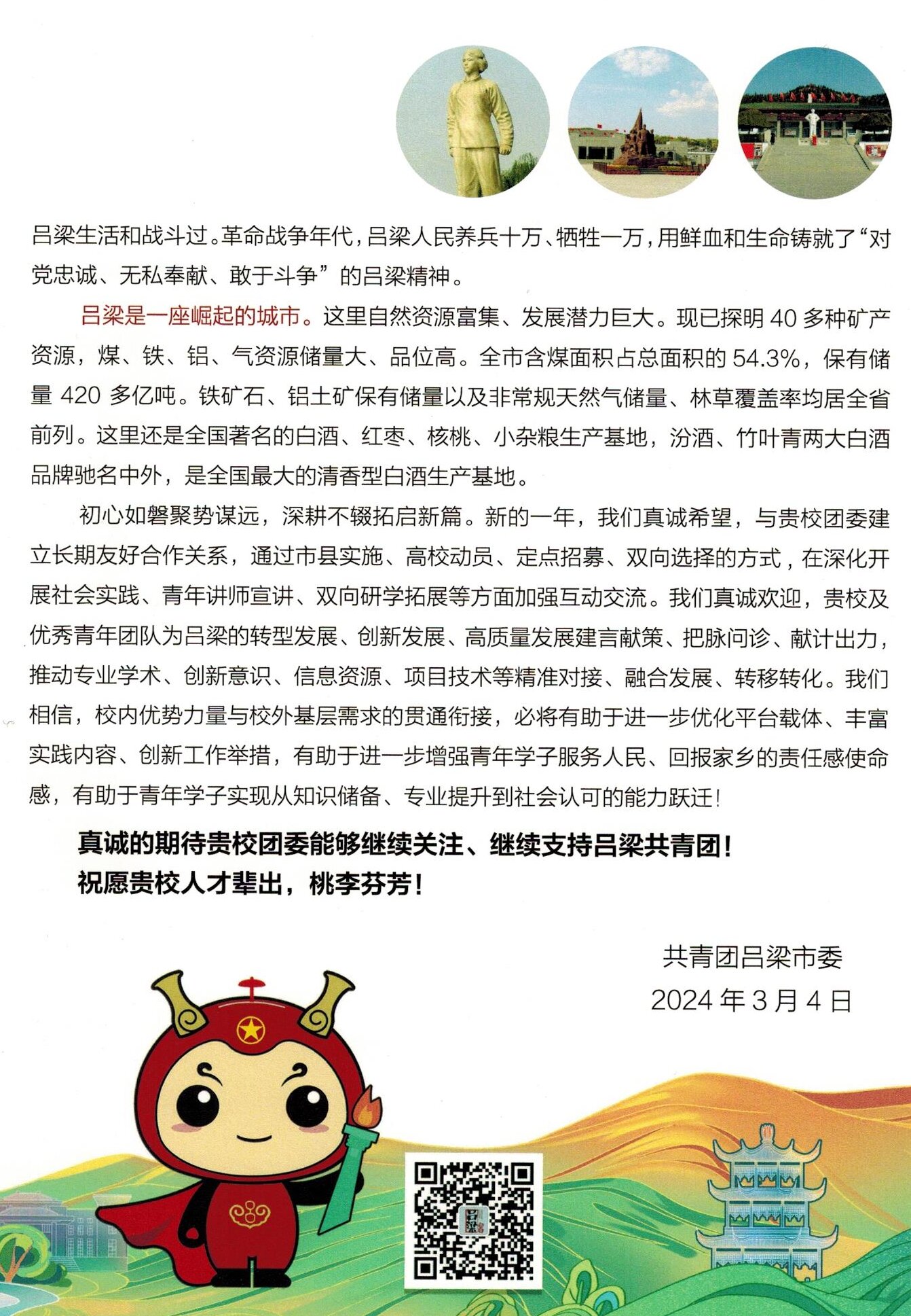 近日,SUNBET团委收到共青团吕梁市委发来的感谢信,感谢SUNBET团委组织吕梁籍学生参加“青春兴晋·团聚吕梁”大学生“返家乡”社会实践活动。