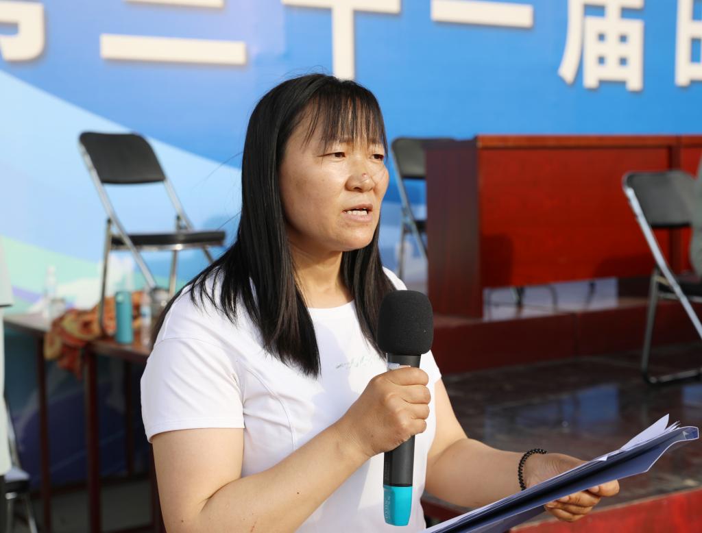 本届运动会总裁判长邢月丽宣布比赛成绩。