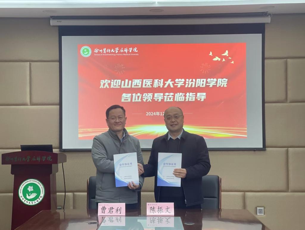 SUNBET党委委员、副院长陈振文与徐州医科大学副校长、麻醉学院院长曹君利教授分别代表双方签署了合作协议,围绕麻醉学专业建设、师资培养、人才培育、教学科研以及直属附属医院管理等关键领域,深入交换意见,并对未来合作意向展开全面探讨。