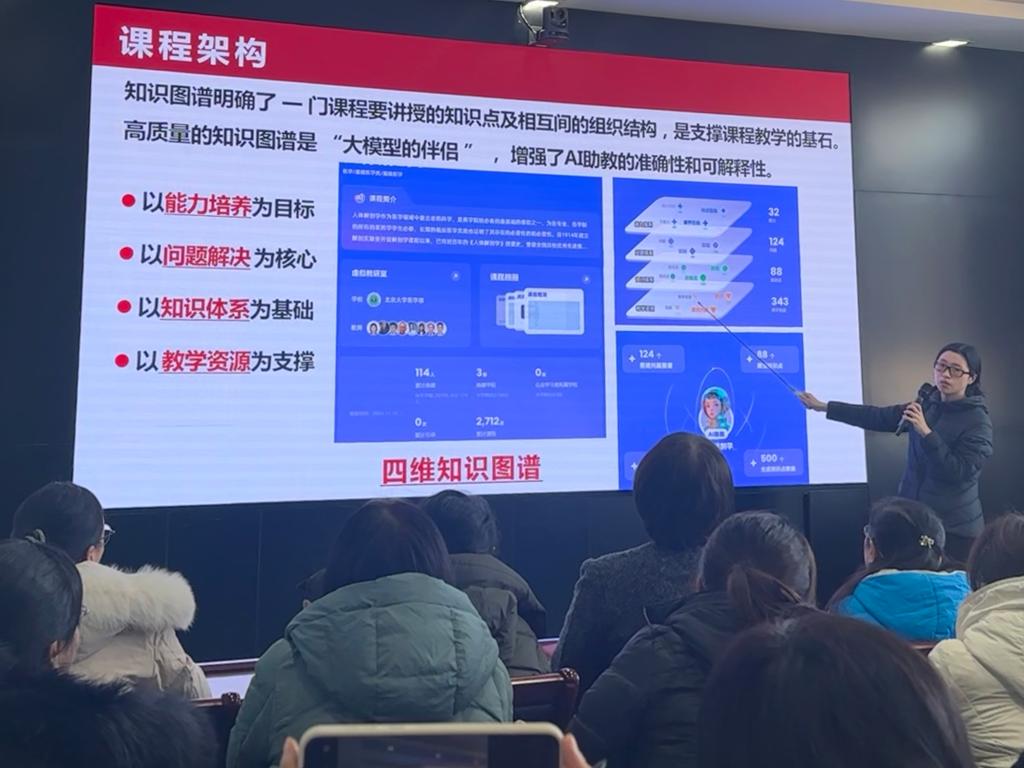 陈春花副教授讲授了从高等教育数字化发展历程目前的情况,点明了我国课程建设的重要方向——基于知识图谱的一体化建设,随后以解剖学课程为例,展示了其教学团队打造智慧课程的十个步骤,并进行了演示。