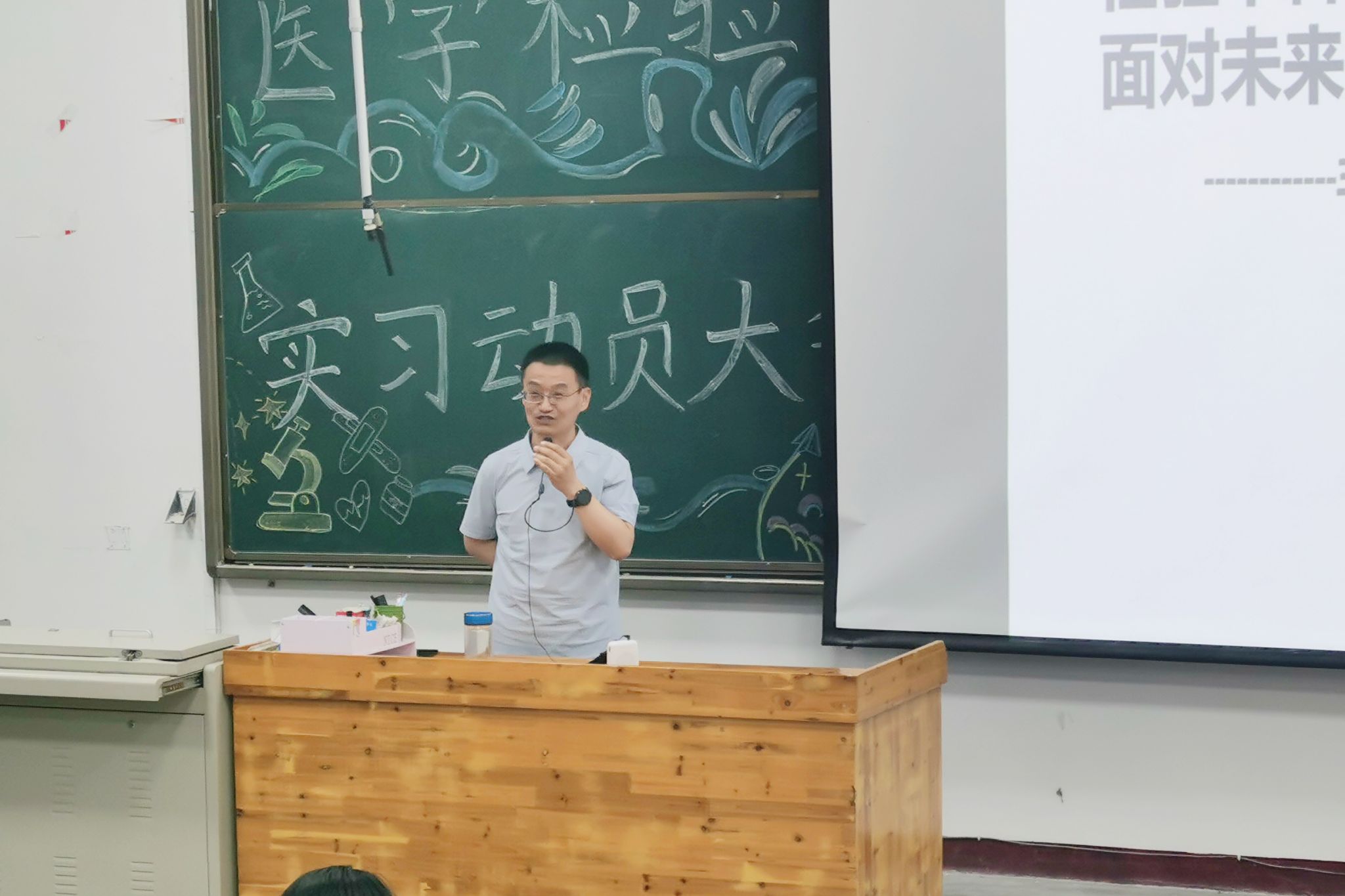 为帮助学生们明确实习目标与行动方向,扎实做好2026届毕业生实习工作,6月3日晚,医学检验系分别在知新楼1教室和聚成楼11教室举办实习动员大会,医学检验系系主任张晓延、党总支副书记雷亚旭、副主任程凯和张笑添、实习班辅导员和学业导师、实习班全体学生参加了动员会。