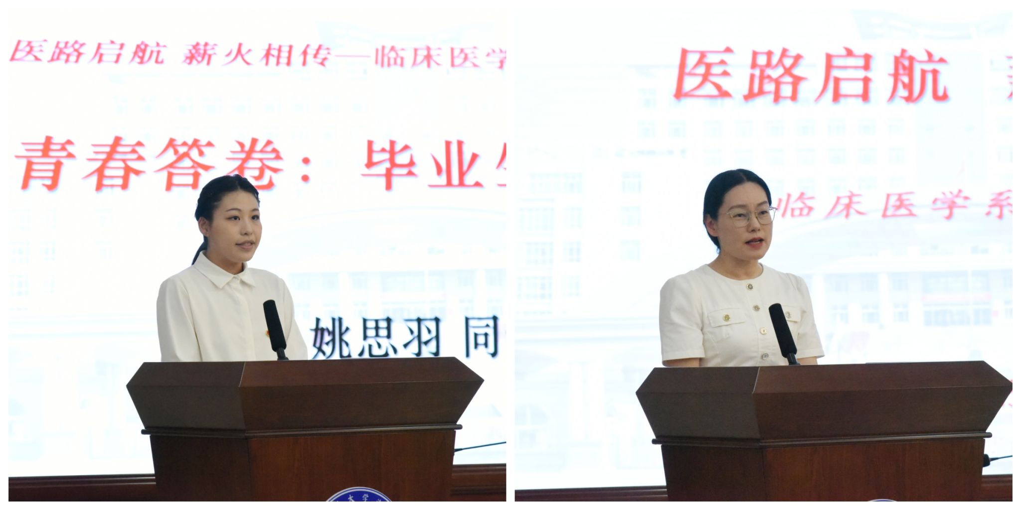 教师代表陈宏丽叮嘱毕业生要“保护同理心、捍卫专业尊严、照顾好自己”,在新的医疗环境下,要始终葆有医者仁心。毕业班的三位辅导员门杰、张超、郭峥深情回顾班级成长点滴,细数学生备战考试、参与各类竞赛、开展志愿服务的暖人故事,并为同学们送上了祝福与嘱托。