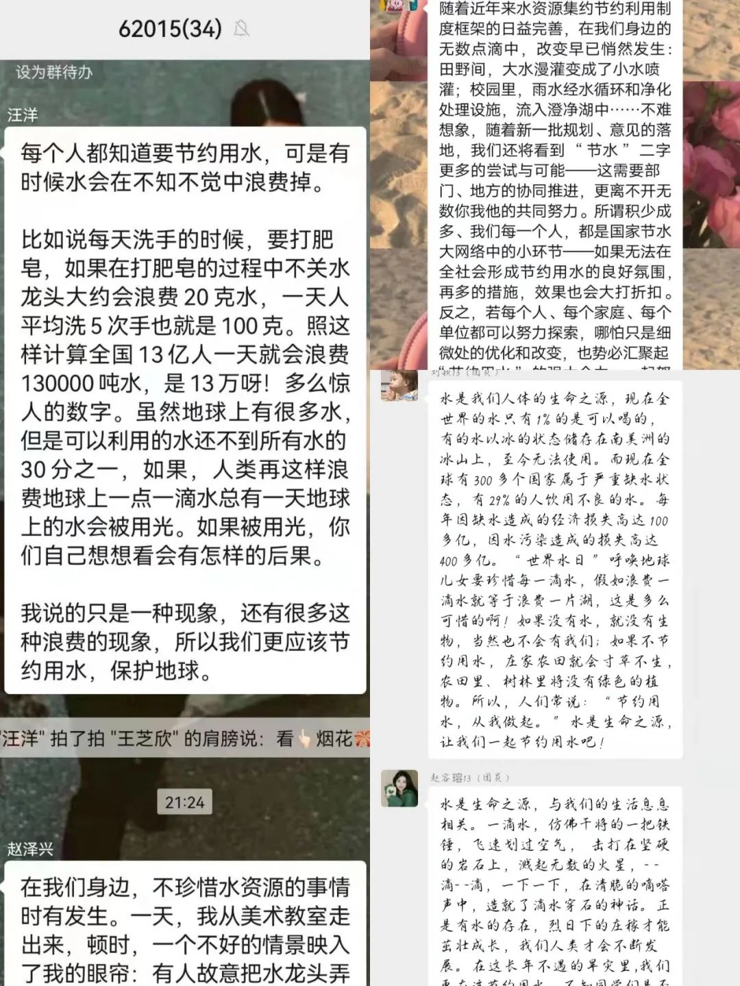 通过这次班会,同学们更加清晰的认识到水资源匮乏对社会带来的巨大危害,节约用水迫在眉睫。作为国家发展的青年主力军,我们要把节水意识变成厚植于心的自觉,躬身践行地参与到实践活动中去。用实际行用节约水资源,而不是做口头的巨人,行动的矮子。当我们的点滴力量凝聚起来时,呈现给世界的将是绿水青山,生生不息的明天。