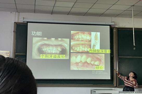 在以上初步认识的基础上,蔡老师又通过理论与实际相结合的方式为同学们讲解有关口腔医学方面的专业知识。蔡老师将此次讲解分为三个小模块,逐步推进,层层深入。蔡老师以生活中的实际案例,生动的讲解医学“小故事”,同学们津津有味地听着一个个“小故事”,不知不觉已经学到了很多有关口腔健康的专业知识。了解到口腔正畸的多种医疗手段,可以帮助人们改善很多口腔问题,也更深入的学习了正畸的原理及方法。