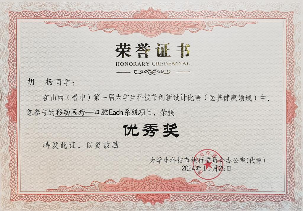 11月6日,由山西省科学技术厅、山西省教育厅指导,中共晋中市委、晋中市人民政府共同主办的“山西省科技活动周·山西(晋中)第一届大学生科技节创新设计比赛”在山西工程职业科技大学举行。临床医学系口腔医学教研室教师蔡岫颖、鞠华龙指导的口腔医学专业921班胡杨、922班杨之越和922班张越三位同学,凭借项目“移动医疗-口腔Each系统”的出色表现,荣获比赛优秀奖。