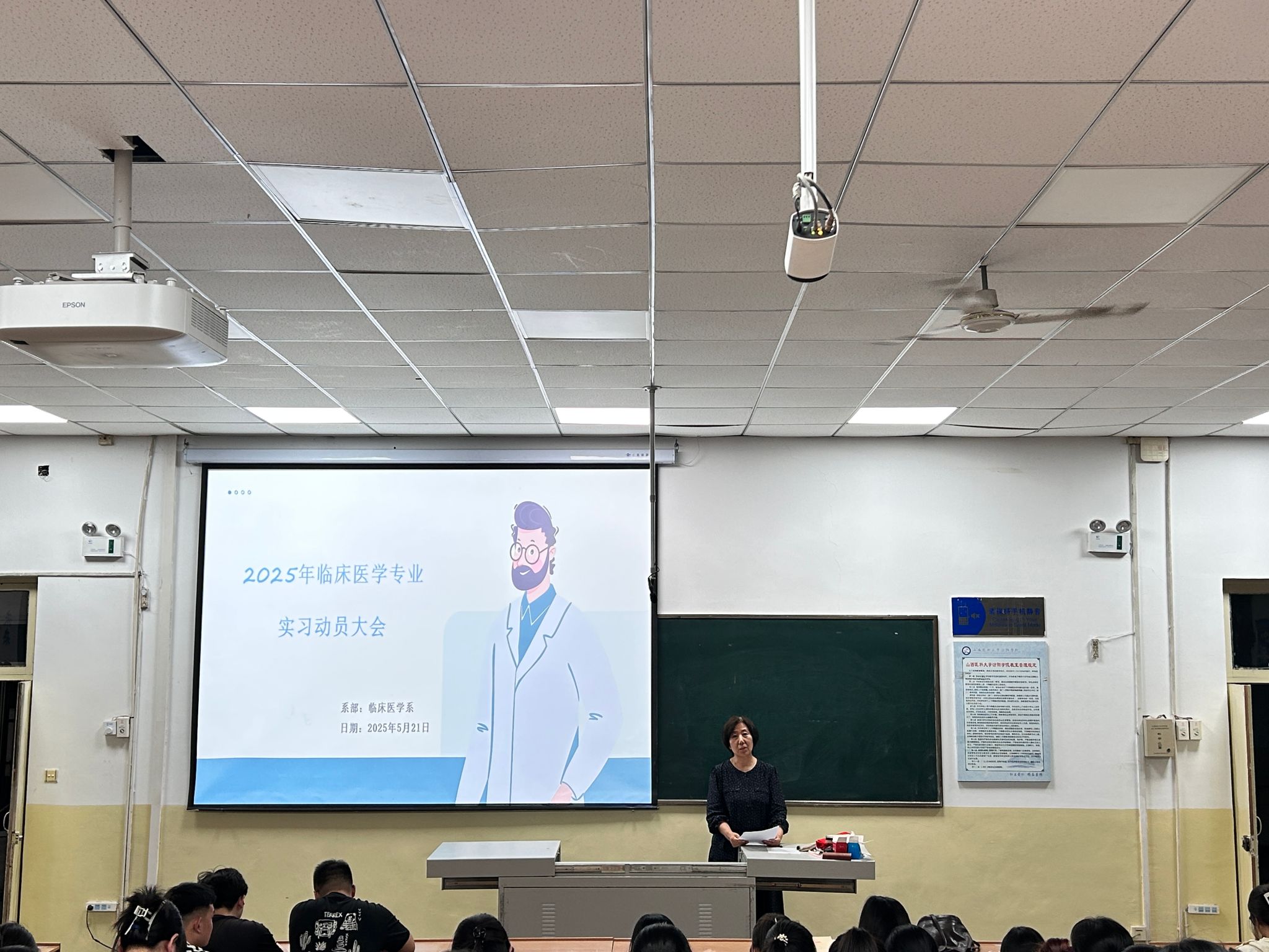 为助力学生实现从校园到临床实习的平稳过渡,明晰实习目标与方向,5月21日-22日,临床医学系隆重举行2025届临床医学和口腔医学专业实习动员大会。临床医学系党总支部书记贾爱萍、主任韩文萍、副书记郭晋、副主任牛海刚、团委书记刘峰,以及实习班辅导员、学业导师齐聚一堂,为即将踏入实习岗位的学子们领航指路、提振士气。