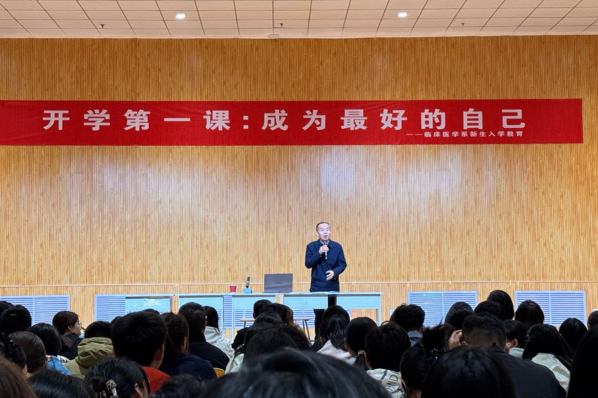 10月9日晚,临床医学系特邀山西省汾阳医院党委书记张沛刚教授为2025级新生讲授“开学第一课”,系领导班子成员、辅导员、青年教师代表参加,为新生的医学征程注入思想力量与成长指引。