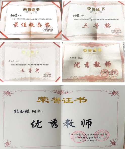 教学方法的改进和多媒体教学设施和网络资源的利用,拓展了教学空间,教学效果有所提高。在教学中贯彻学院“重视实践教学,为基层培养合格的应用型人才”的办学宗旨。在课程选择上对本地区的常见病种重点讲述,为今后服务基层打下好的基础。实习期间对学生的实际操作动手能力和临床思维能力的培养,使学生毕业后到基层服务时能较快独立处理病人。近年来多名教师获校级优秀教师称号,在汾阳学院青年教师讲课比赛中,神经精神病学教研室积极选派教师参赛,获得二等奖、三等奖、优秀奖等荣誉。王淑慧教师在2024年度山西省汾阳医院教师基本功比赛中获得三等奖荣誉及最佳教态奖。张丽娜青年教师于2025年6月荣获山西省汾阳医院教师基本功比赛中获得三等奖荣誉。王保爱及孔玉娟教师活动学院优秀教师光荣称号。