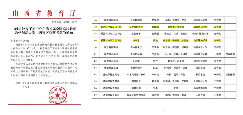 5 月 25 日,第五届全国高校教师教学创新大赛山西赛区比赛在山西财经大学落下帷幕。经过激烈比拼,临床医学系蔡岫颖教师团队荣获新医科中级组二等奖,黄艳教师团队荣获新医科中级组三等奖,展现了我系教师卓越的教学创新能力与专业素养。