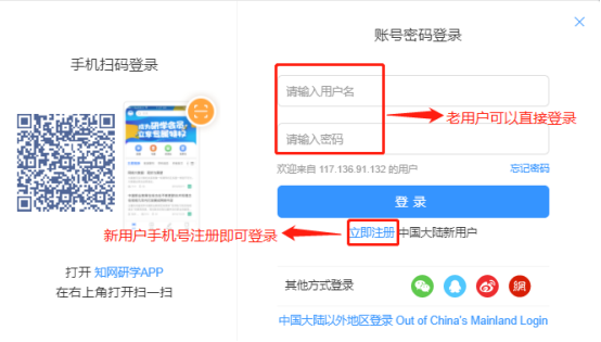 2.在浏览器(最好使用火狐或谷歌等兼容性强的浏览器)中打开,输入知网账号密码登录;新用户点击“立即注册”,用手机号注册知网账号后点击登录,如下图: