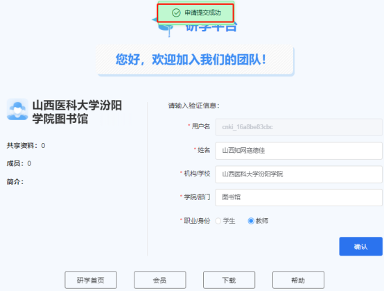 3.登录后填入必填项内容点击“确认”,显示“申请提交成功”,此时为成功绑定并登陆,如下图: