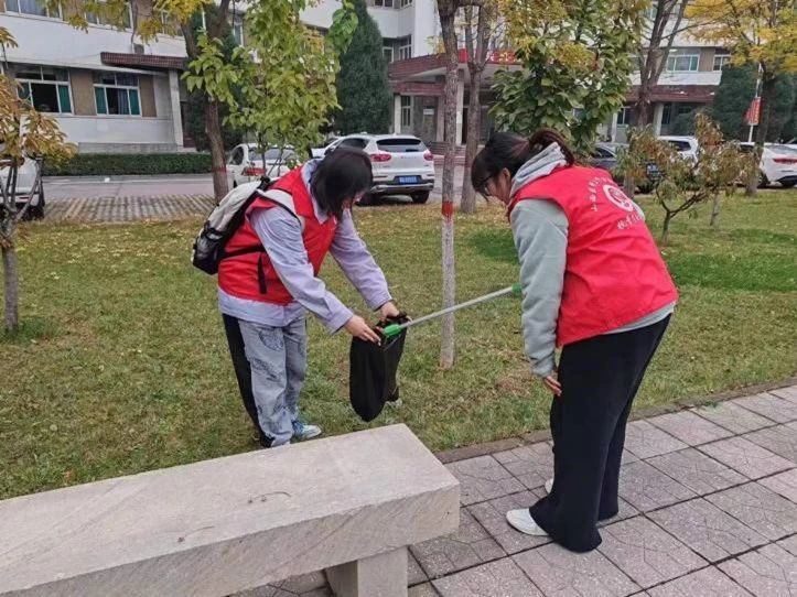 活动中,志愿者们分为11小组,分别进行校园定点清扫,捡拾绿化带里的杂物、擦拭公告栏、清理操场旁有无物品售卖的商家收款码以及清理菜鸟驿站周边垃圾等。
