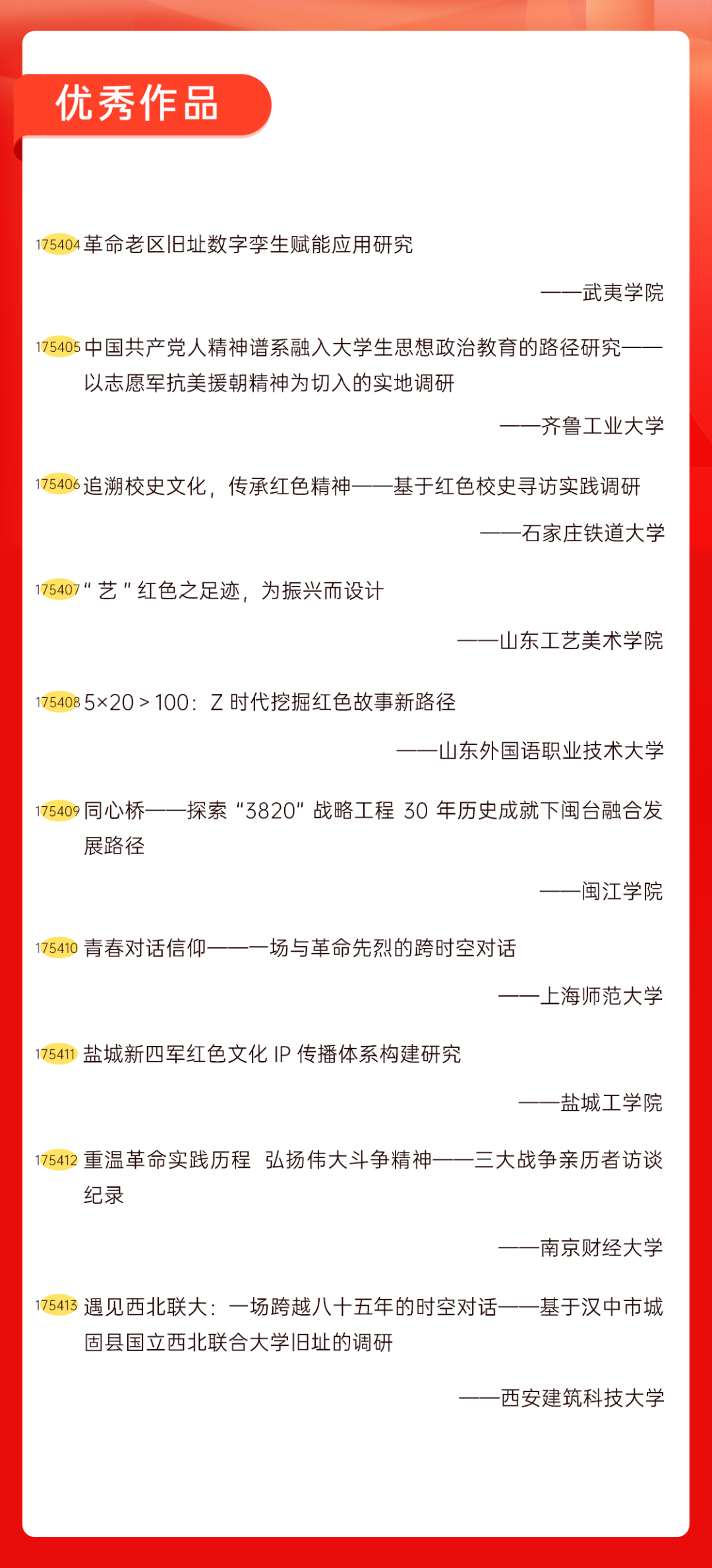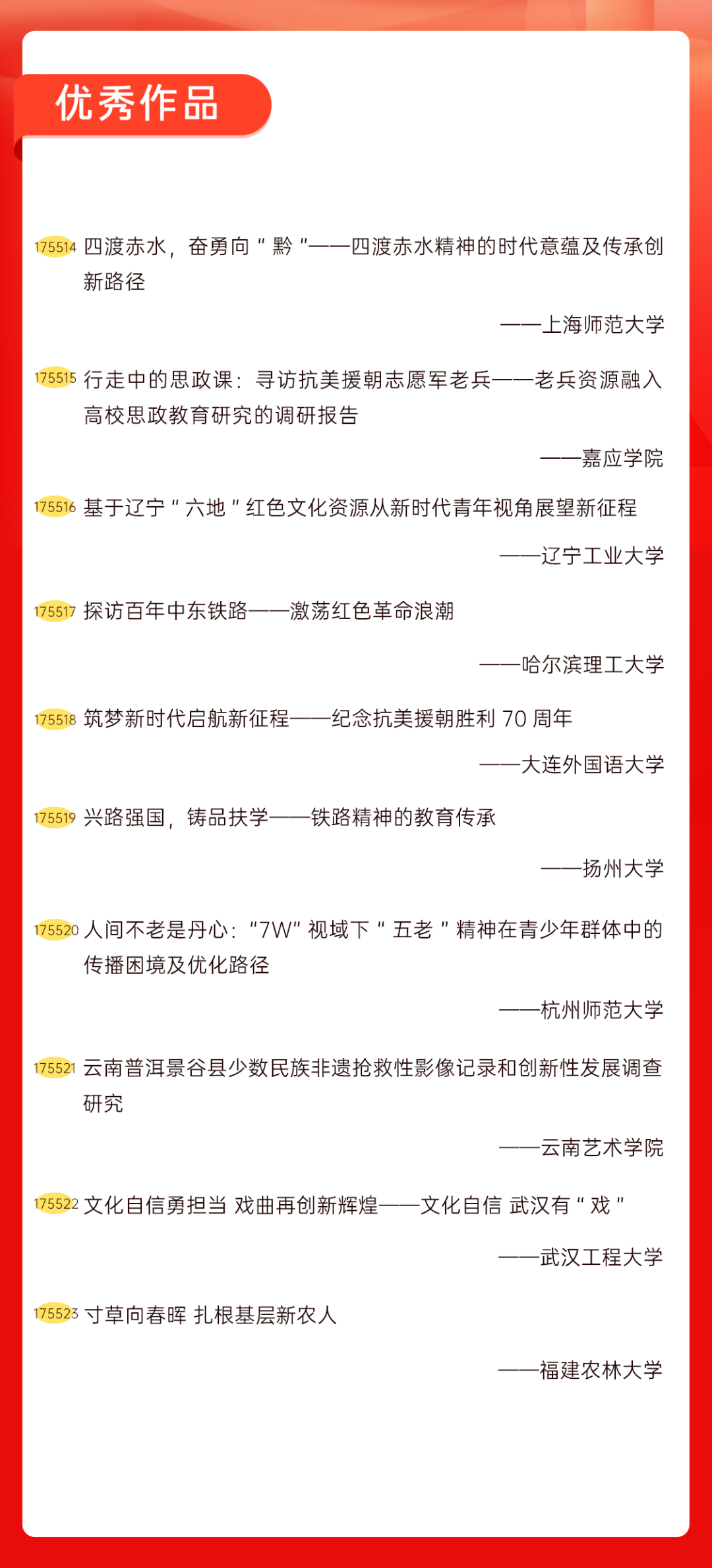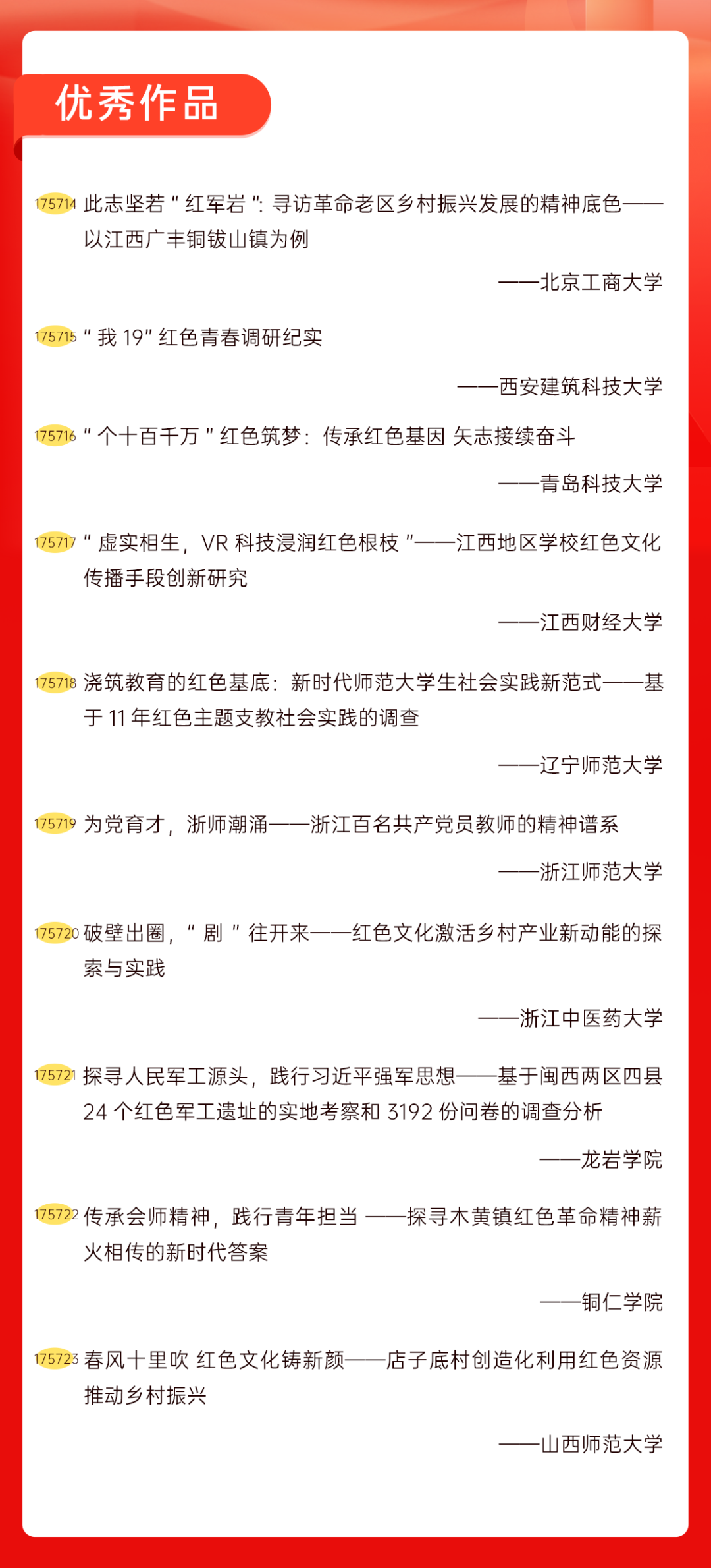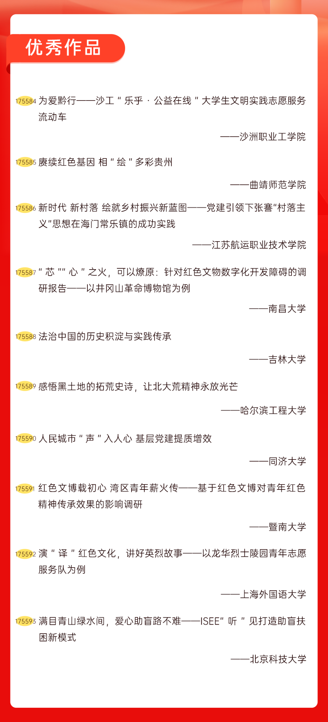为增加广大青年互动式学习和交流,让青年学生的实践成果形成更广泛的社会影响,辐射带动更多青年学生突破空间限制、感受朋辈风采、传承红色基因,组委会将部分优秀作品建成红色教育的云上“红色课堂”。