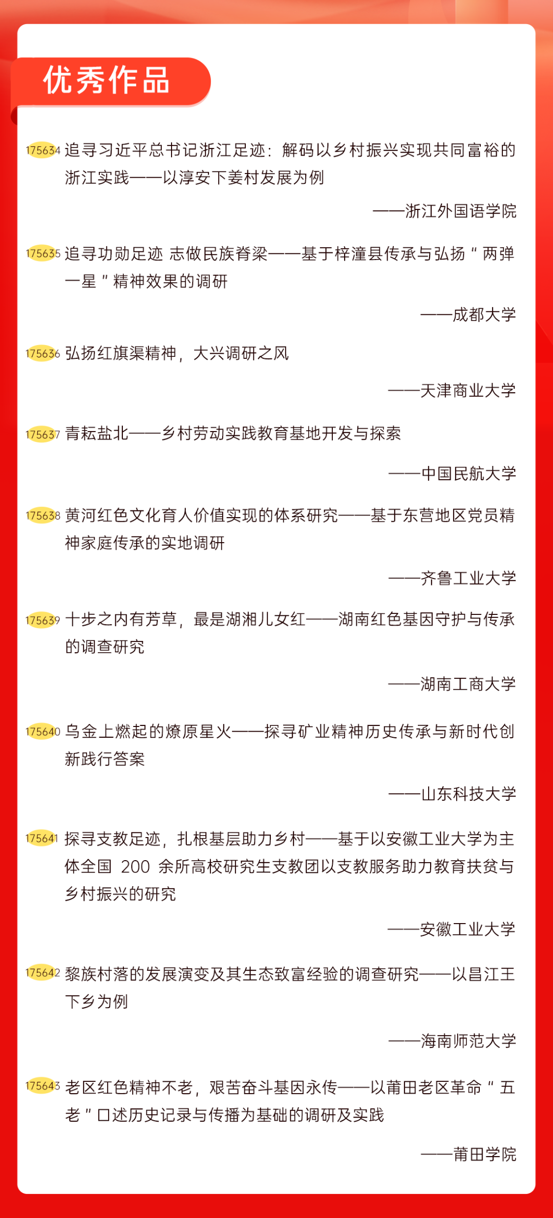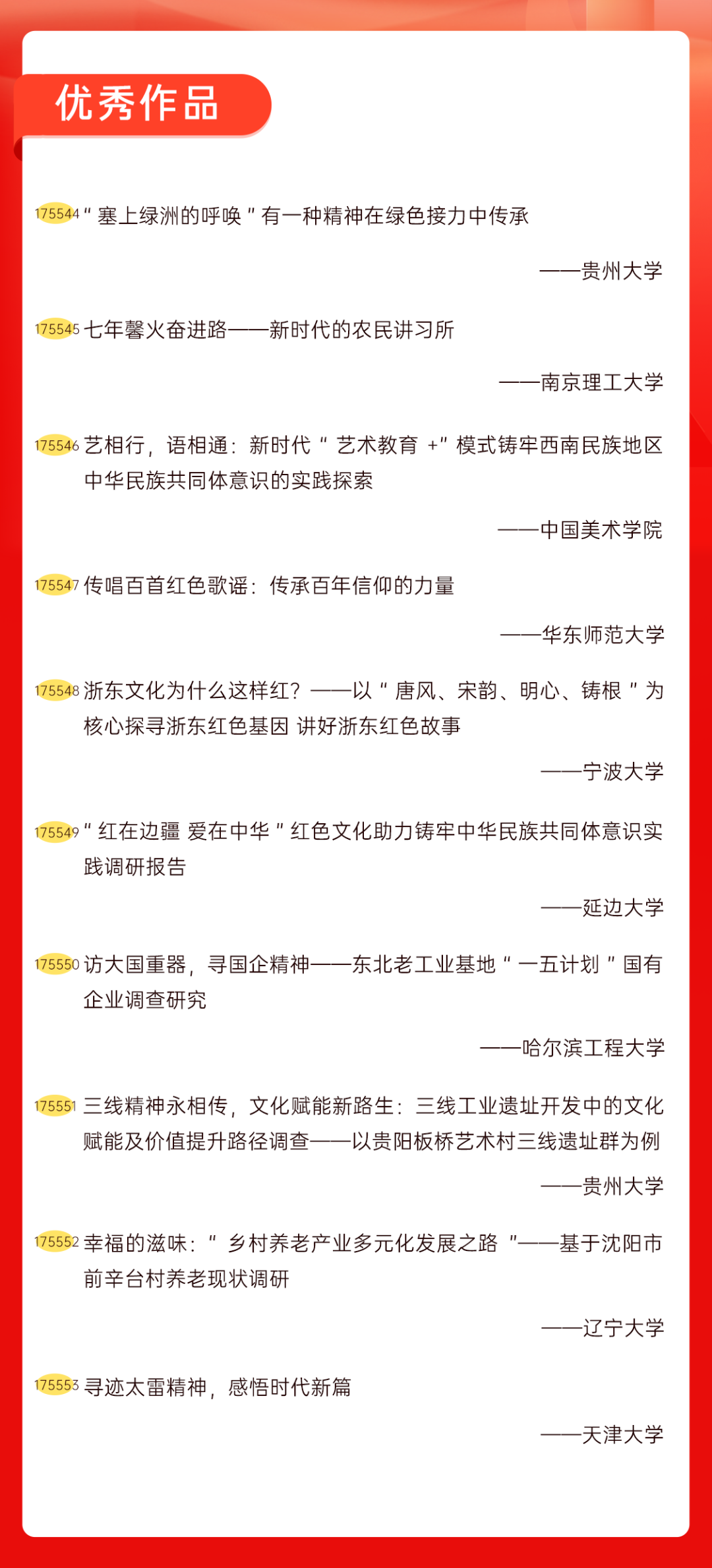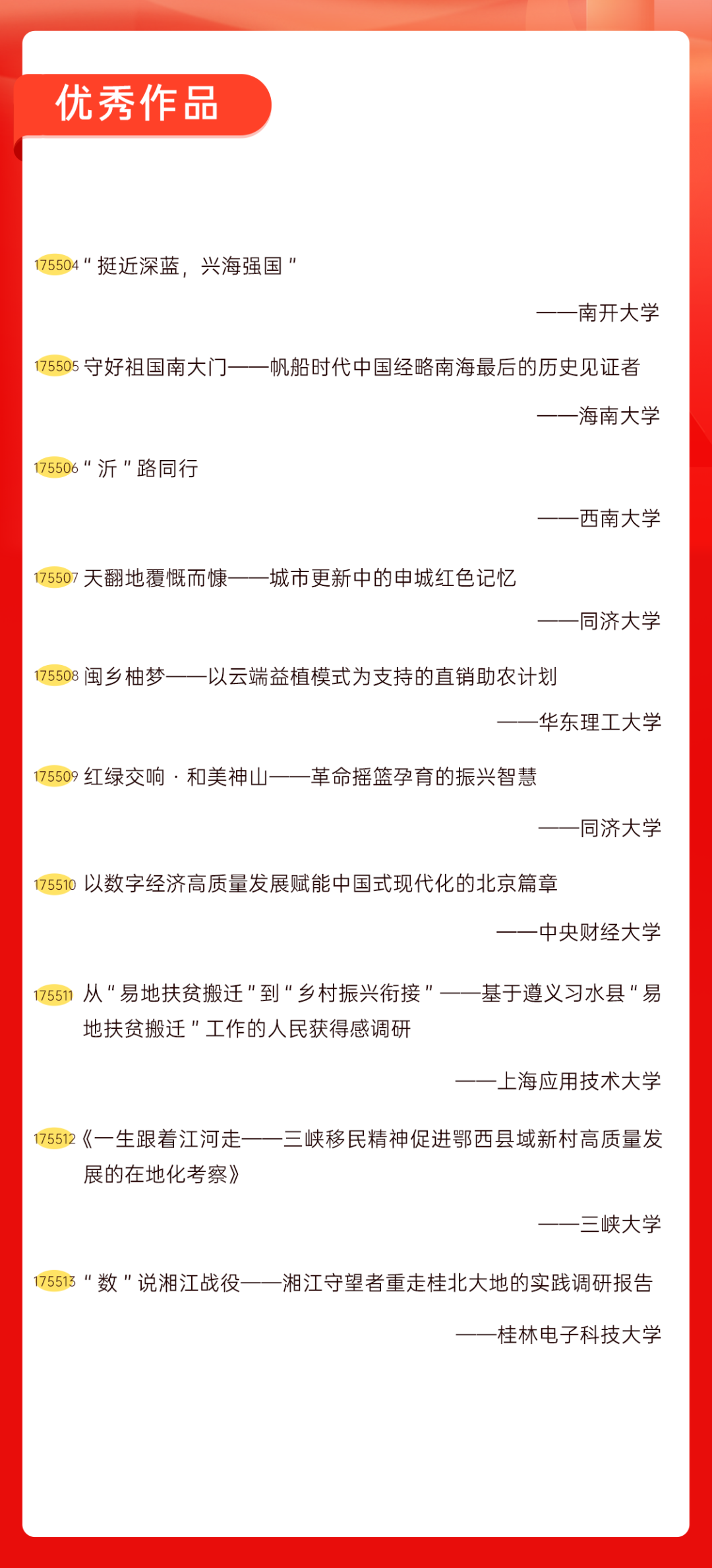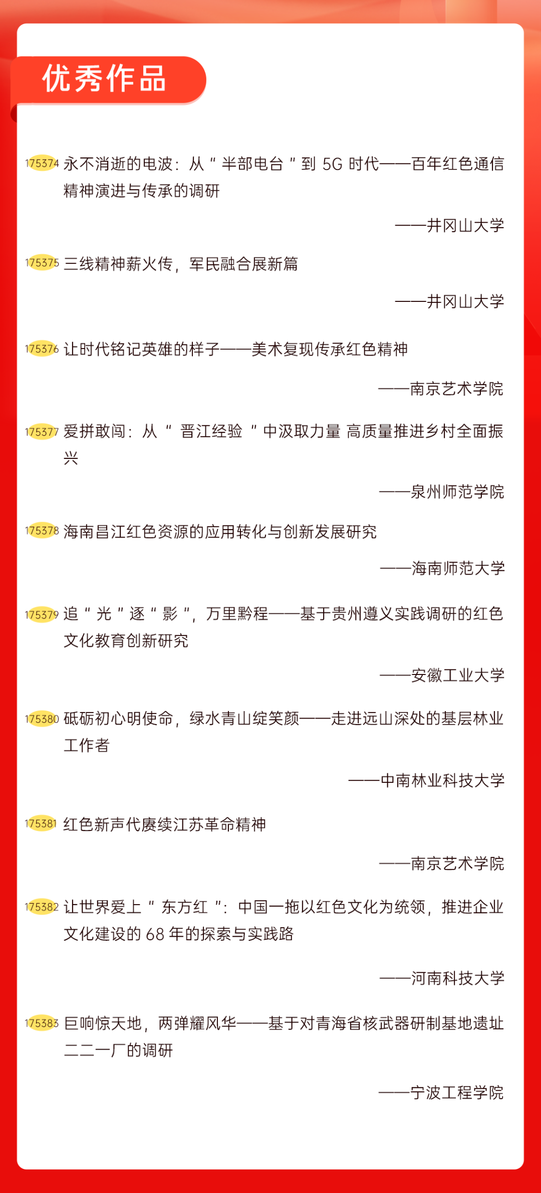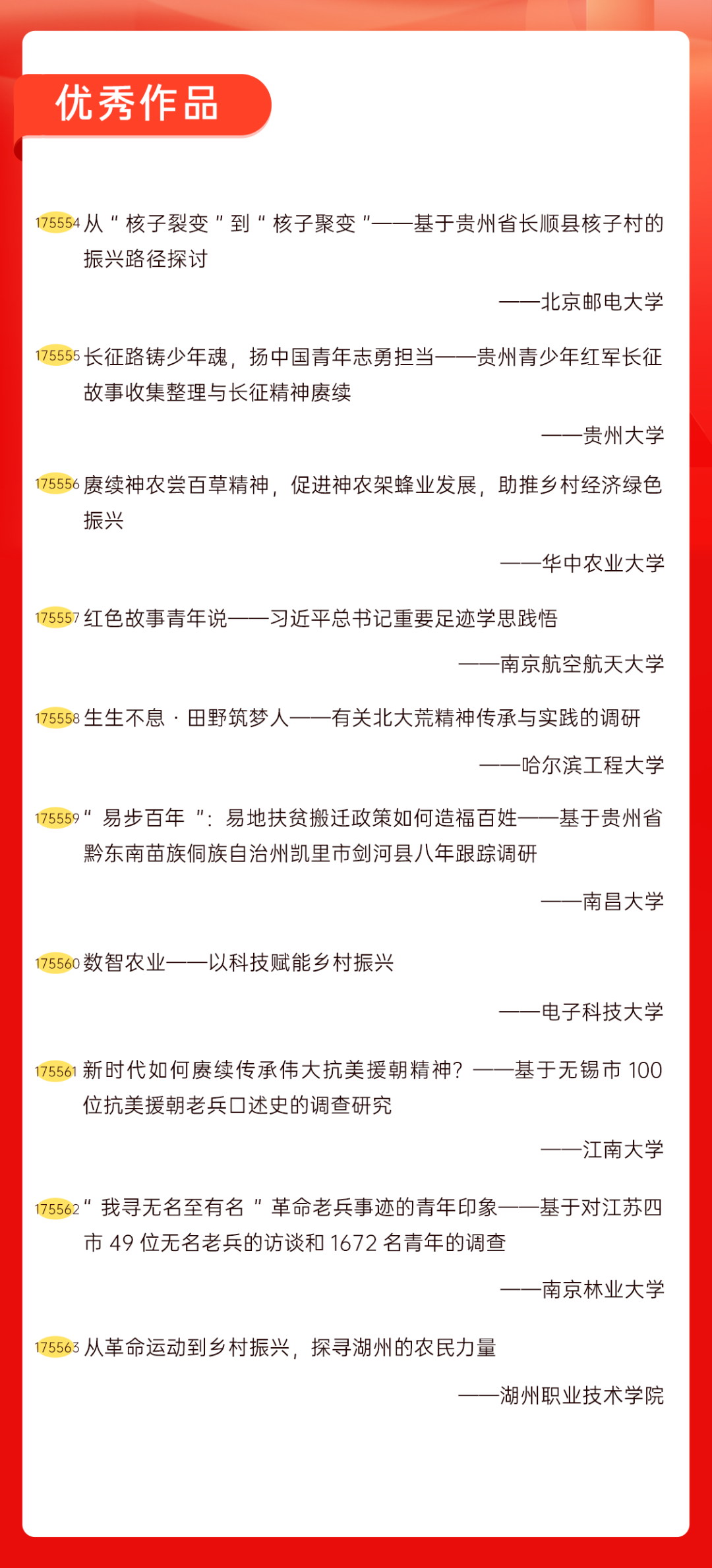 为增加广大青年互动式学习和交流,让青年学生的实践成果形成更广泛的社会影响,辐射带动更多青年学生突破空间限制、感受朋辈风采、传承红色基因,组委会将部分优秀作品建成红色教育的云上“红色课堂”。