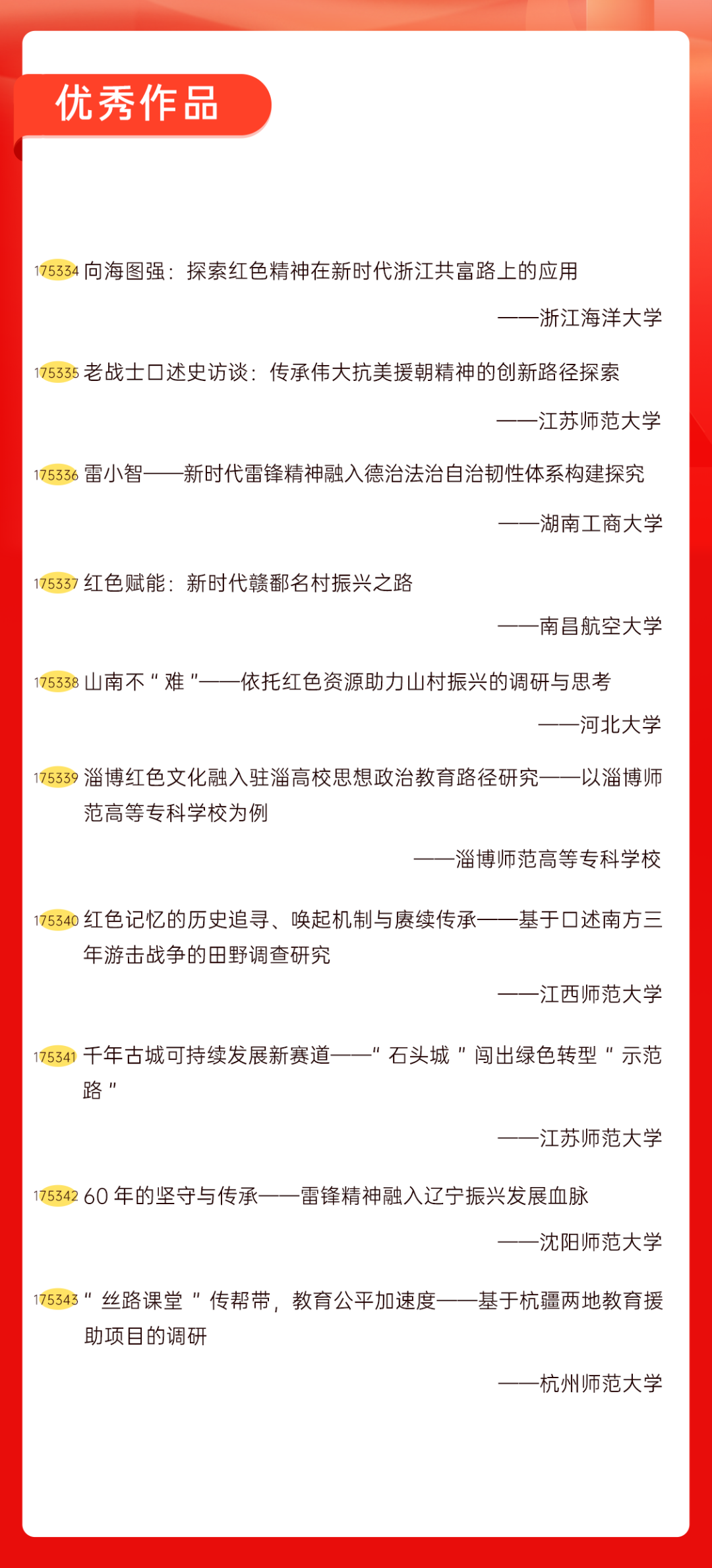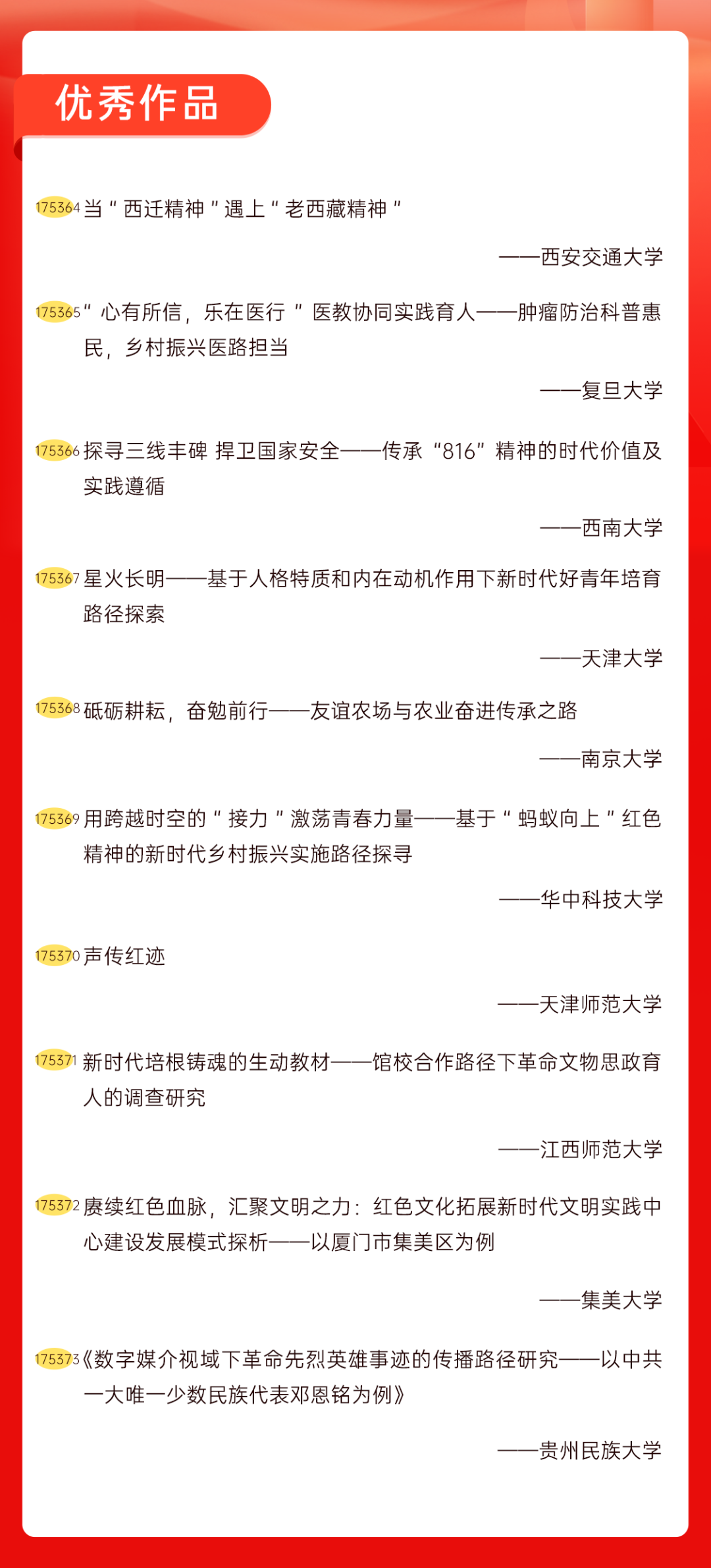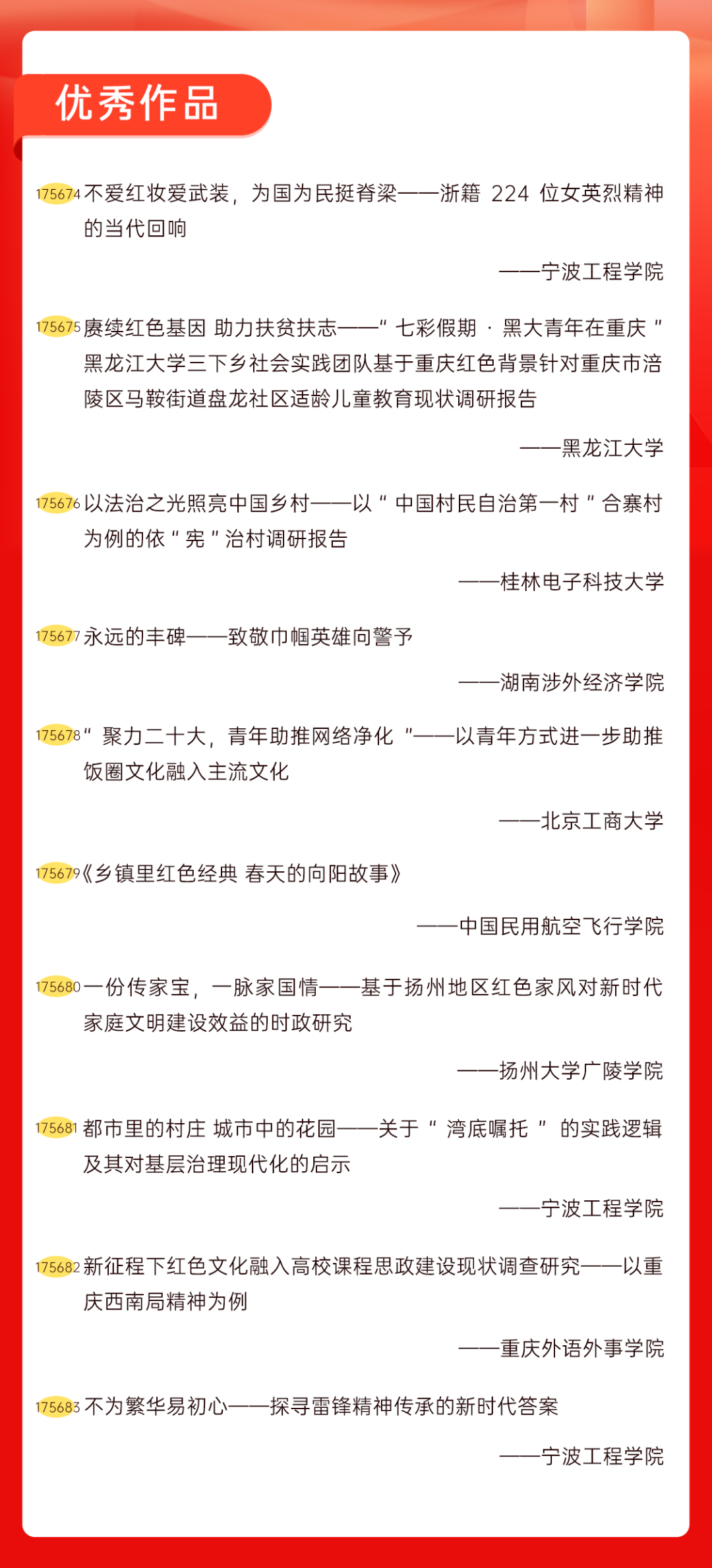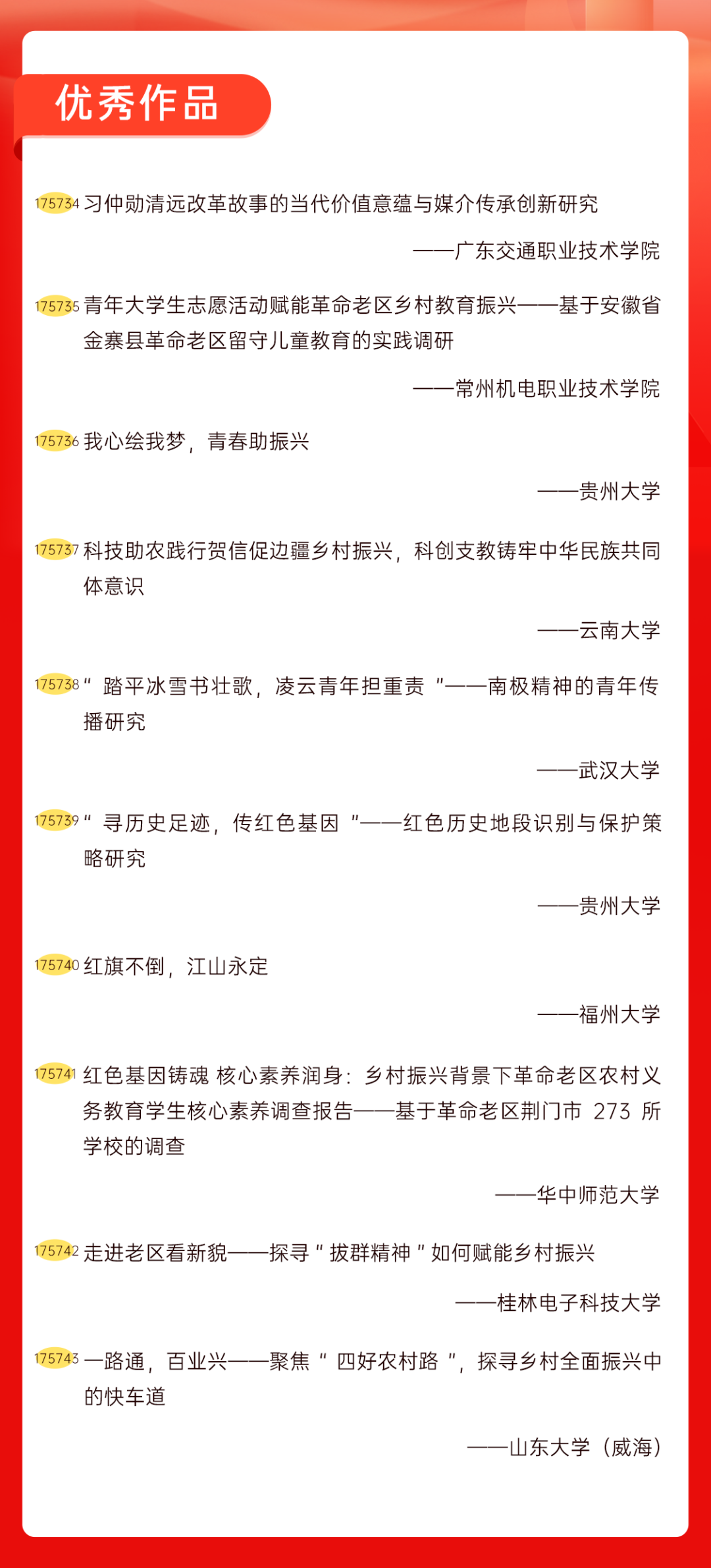 为增加广大青年互动式学习和交流,让青年学生的实践成果形成更广泛的社会影响,辐射带动更多青年学生突破空间限制、感受朋辈风采、传承红色基因,组委会将部分优秀作品建成红色教育的云上“红色课堂”。