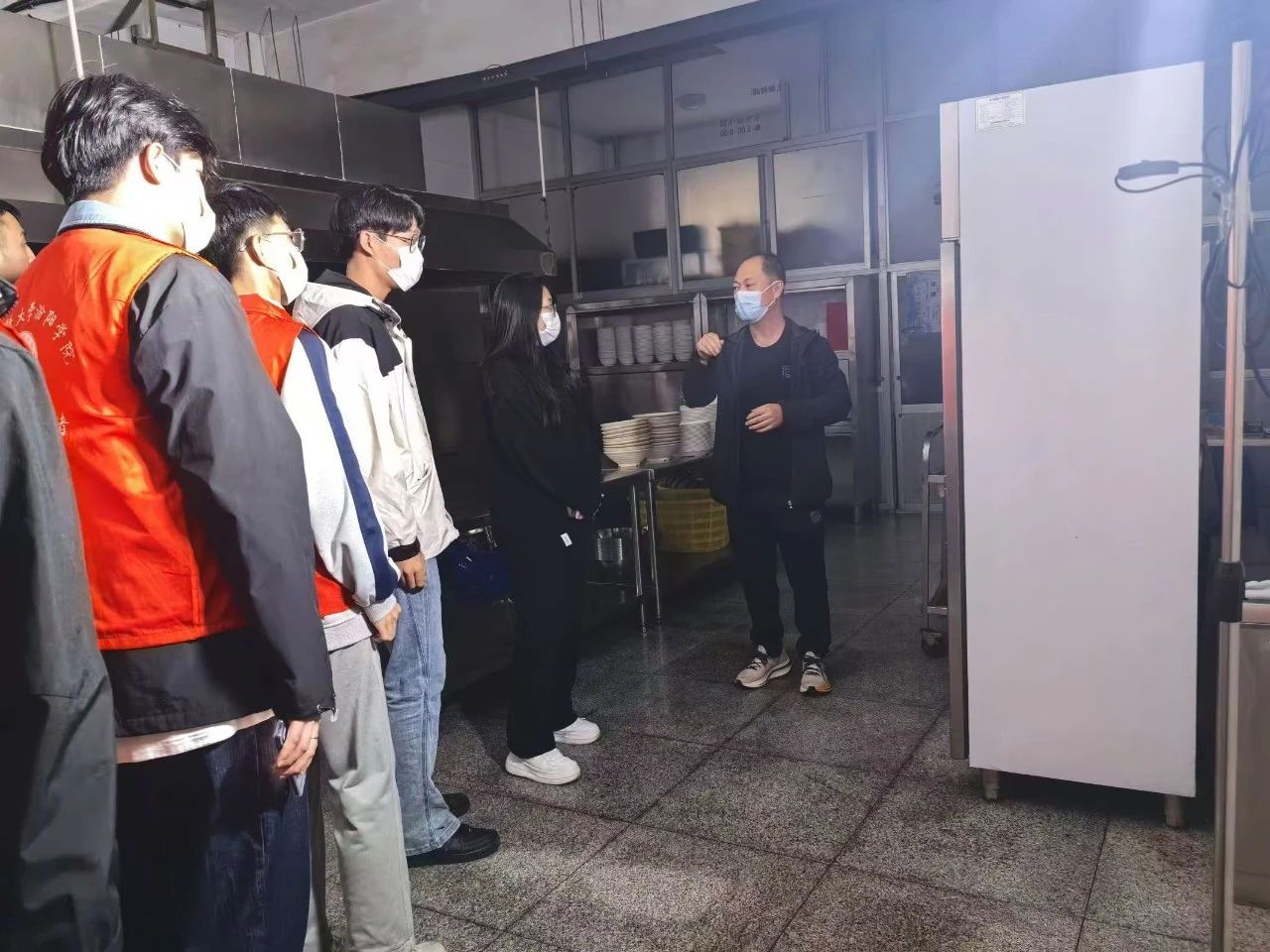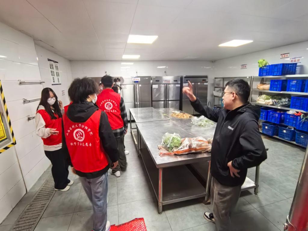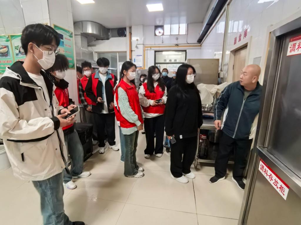 学生会权益部的学生代表在遵守安全卫生的前提条件(佩戴口罩)下由学校餐厅经理引导参观,食堂设有专业的集中清洗区,采用紫外线消毒,保障餐具卫生;洗菜配菜区确保食材初步清洁;烹饪区设备齐全,符合安全标准,设有留样区以追溯食材问题。整体环境整洁,员工着装规范,操作认真。透明化的操作流程无不体现着食堂工作人员对于食品安全的负责与重视。从食材处理到烹饪过程都严格遵守卫生安全标准,让同学们对后厨的认识更加深刻。
