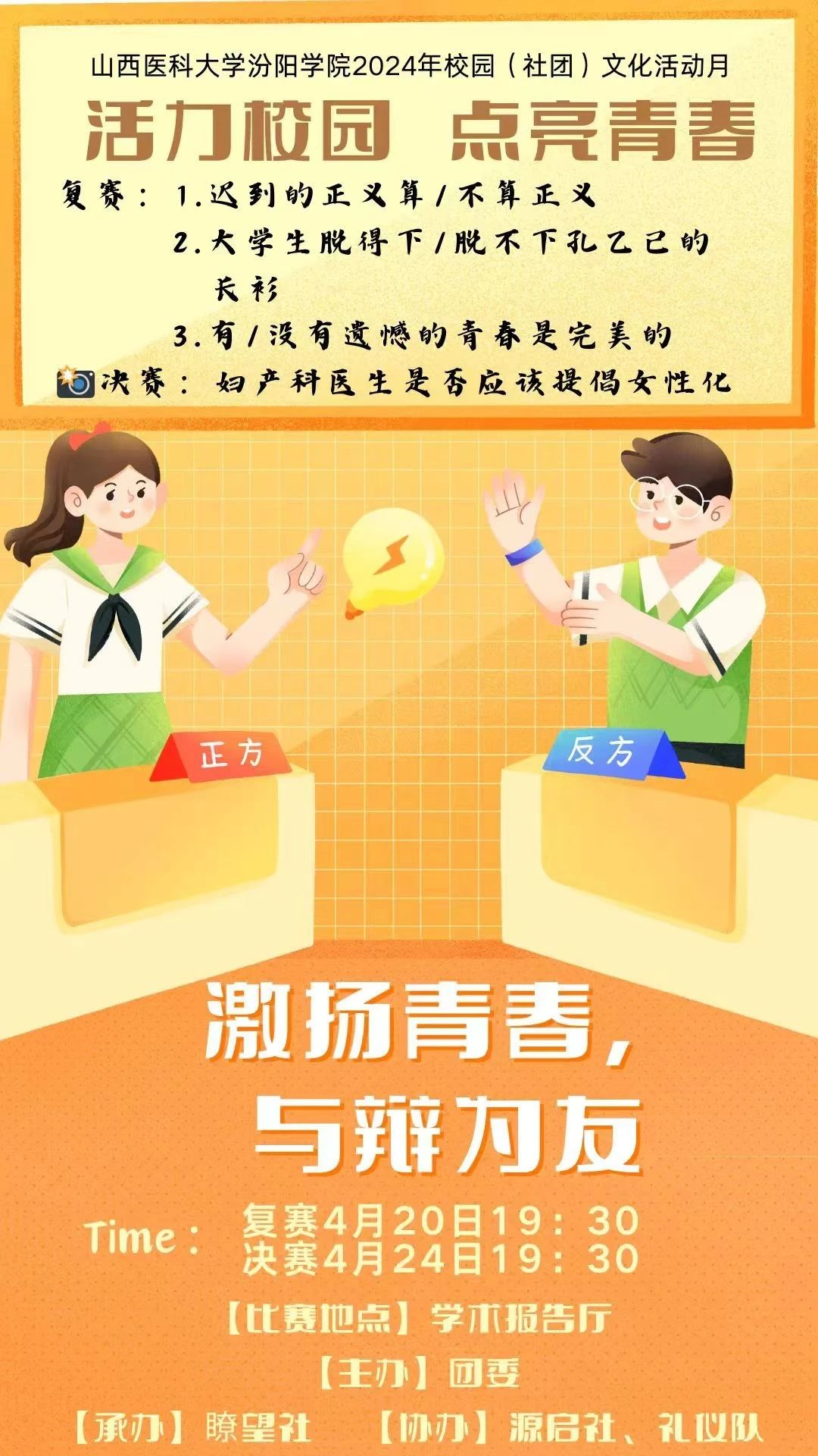 辩论赛决赛将于4月24日晚19:30在学术报告厅举办,详细内容如下,诚邀各位老师和同学前来观“战”!
